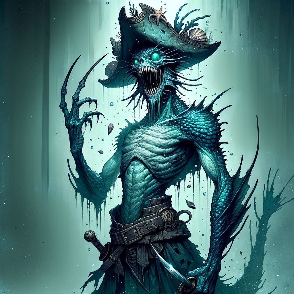 Meet Captain Eelrod, a sinister blend of a deep-sea creature and a ruthless pirate. With a 6-foot sinuous body covered in dark scales, glowing faintly, he exudes an eerie aura. His sharp teeth, reflective eyes, and menacing demeanor make him a formidable figure. Draped in a tattered coat and a seaw