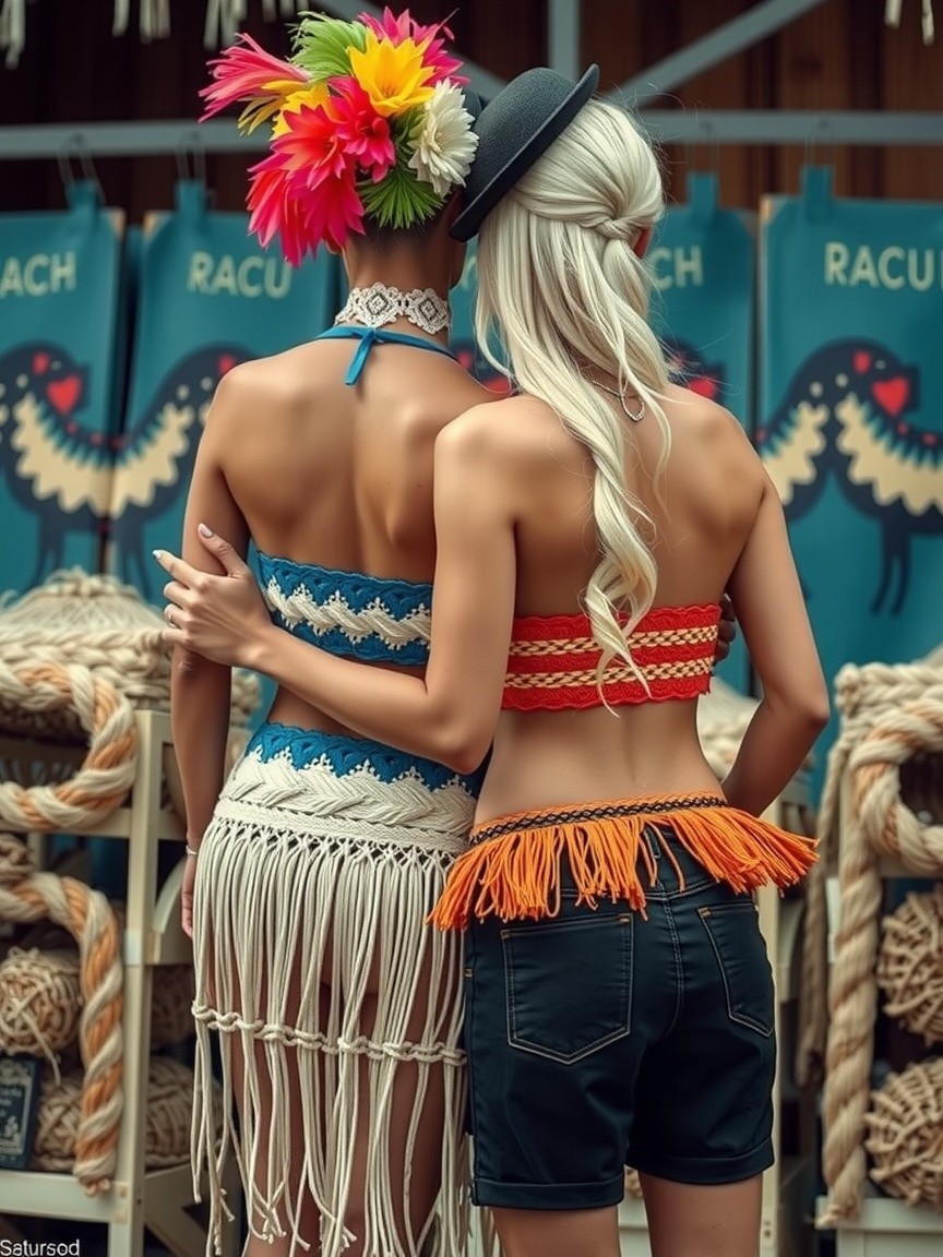 Two women stand back-to-back, showcasing vibrant outfits. One wears a blue and tan ensemble, while the other sports a red and orange look. Their stylish accessories complement the rural setting.