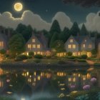A serene nighttime scene features charming houses illuminated by warm lights, reflecting on a tranquil lake under a glowing full moon and adorned with lush greenery and blooming flowers.