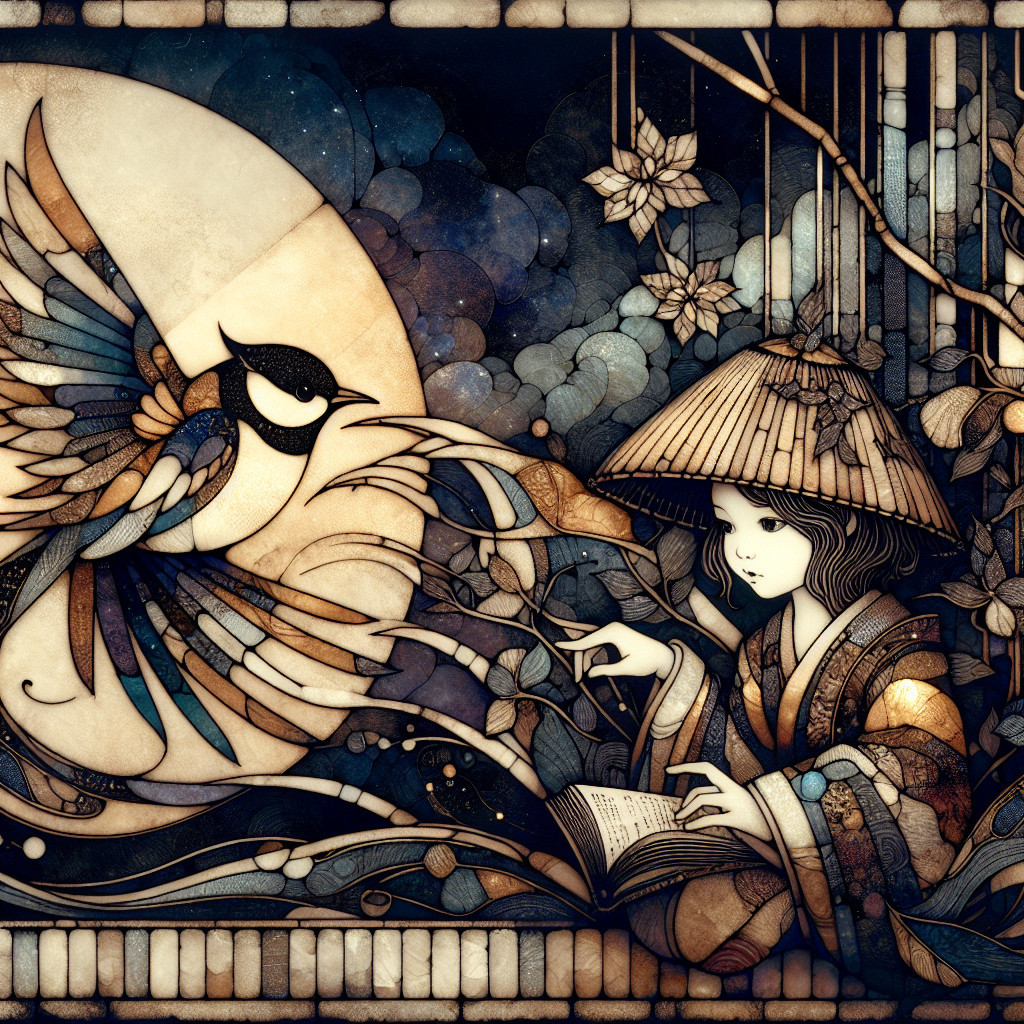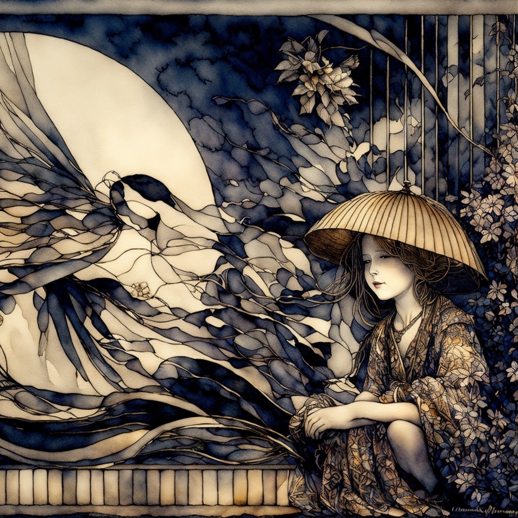 A serene woman sits by a window, reading a book. She wears a traditional outfit and a large parasol. The tranquil landscape features trees and water, creating a peaceful, artistic atmosphere.