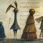 A whimsical, surreal scene featuring figures with globe heads and unique attire, set against a textured background with handwritten notes and a floating globe, evoking a dreamlike atmosphere.