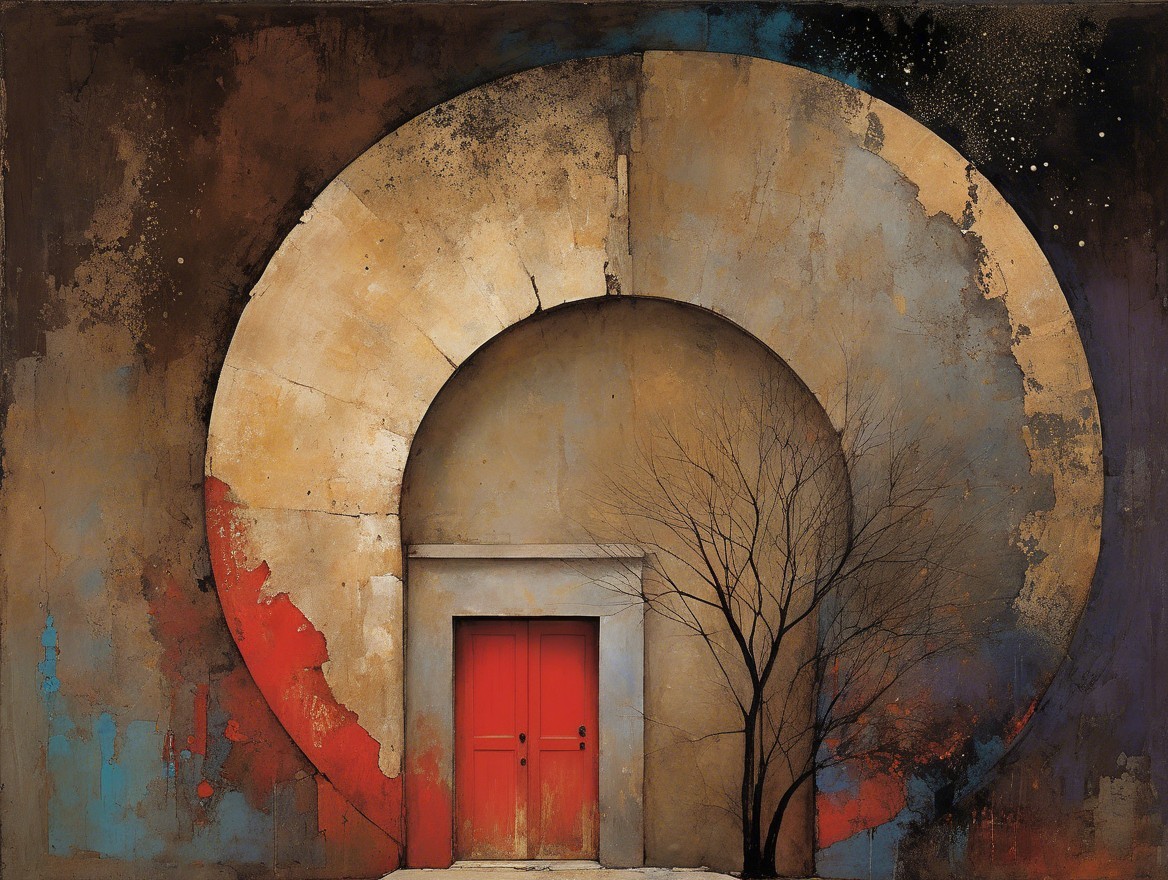 A figure in a coat stands before a large, colorful archway with a red door, surrounded by vibrant, abstract patterns in earthy tones, evoking a sense of curiosity and exploration.