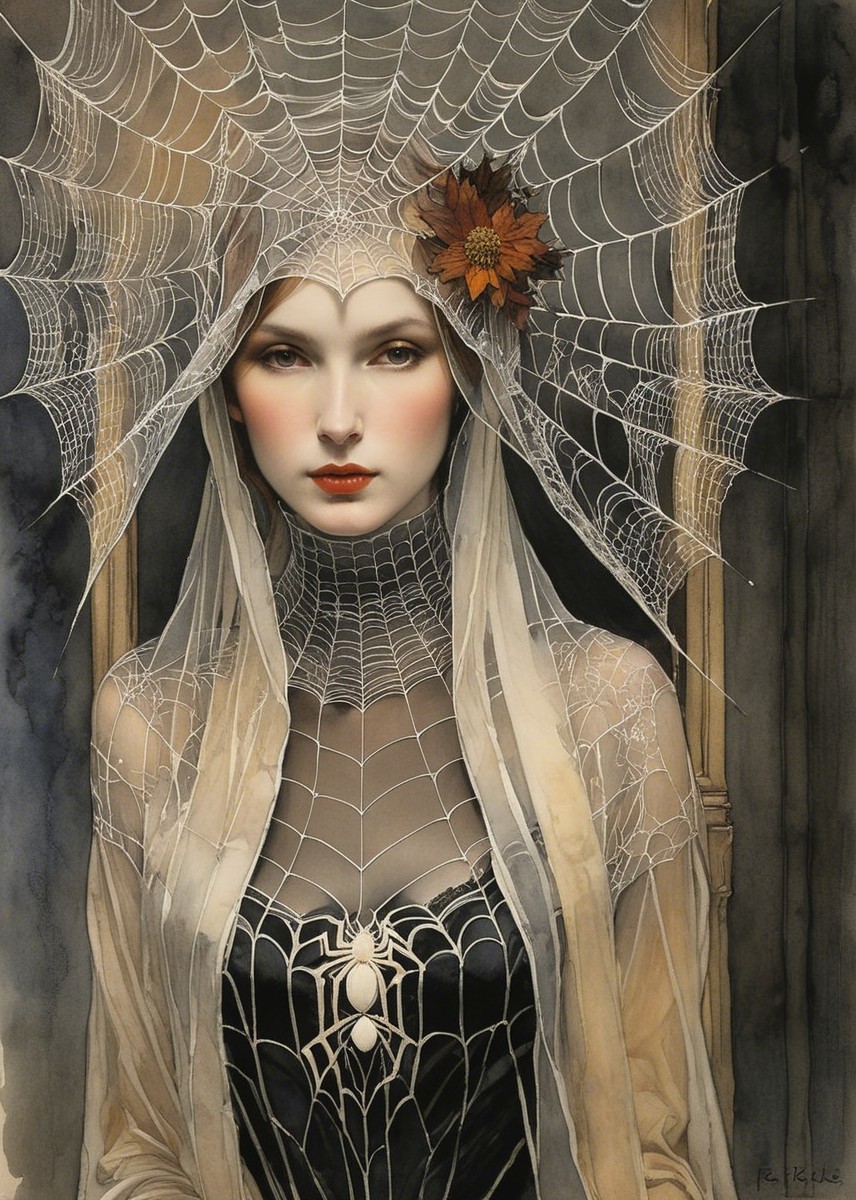 A hauntingly beautiful woman in an ornate black gown and delicate lace veil, adorned with a spider motif, stands against a moonlit backdrop, exuding a mystical and ethereal presence.