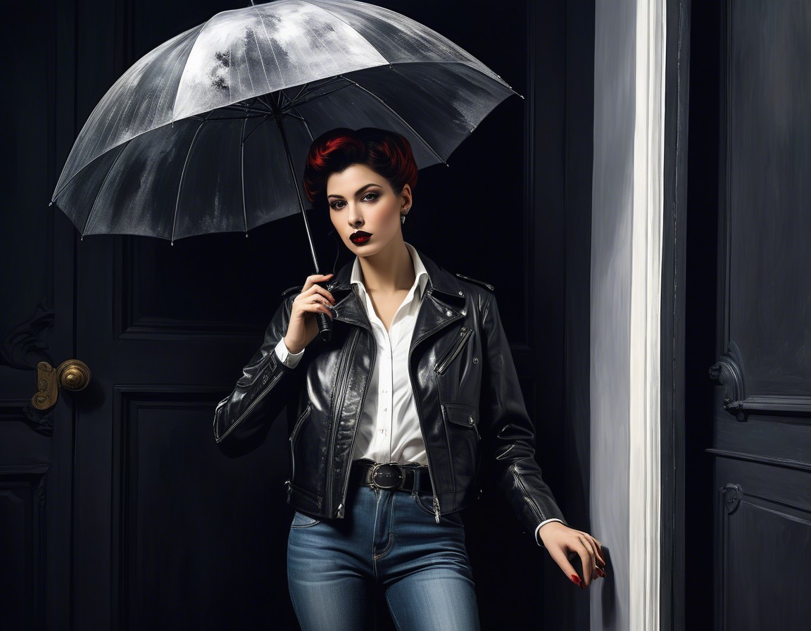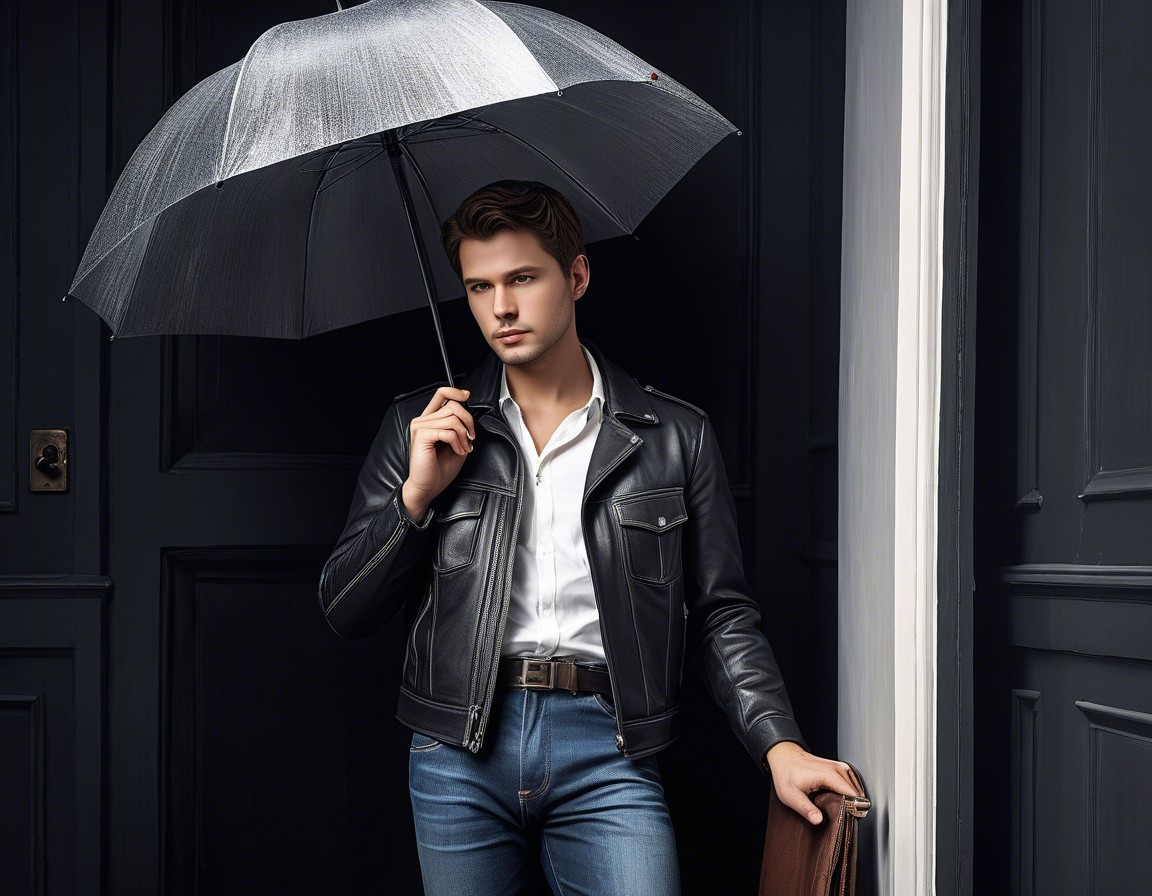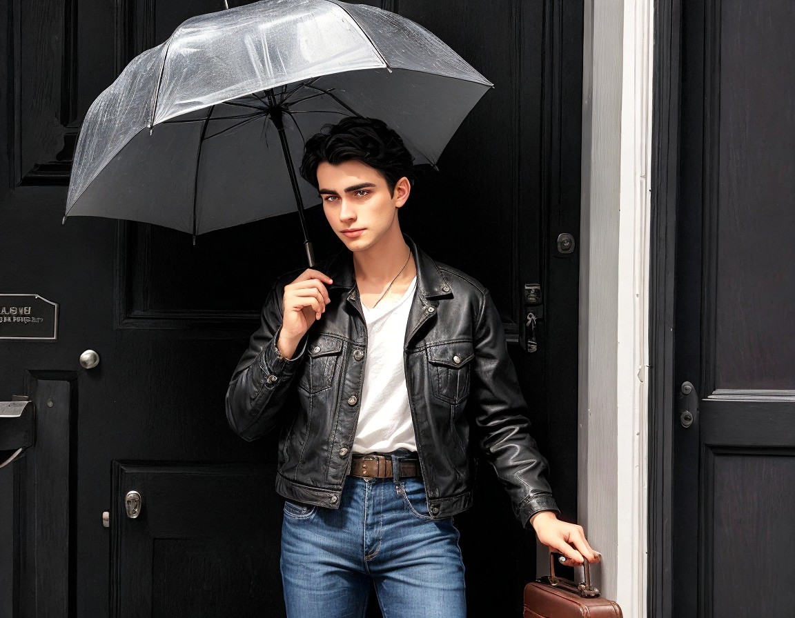 Prompt: "A dark-haired young man in a jeans jacket is standing by the door to an old coffee shop. He holds a leather suitcase in one of his hands and a big black umbrella in another hand. There is a cute little puppy sitting on the tile floor right beside him. Cubist illustration of a detailed German fairy tale. Rembrandt-style lighting, chiaroscuro effect, dramatic shadows, golden hour ambiance, window with white roses in full bloom, fragile vase, detailed petals, soft focus background, high-resolution image, photorealistic quality, warm color palette, golden tones, subtle highlights, captivating EmmAI composition. extremely detailed Award winning photography intricate award winning fantastic view colourful acrylic art whimsical Exquisite ethereal atmosphere Intriguing background high energy Enhanced 3D effects Best AI Generated art Innovative fashion technology Original image created by ©️ ZHV! All rights reserved. Full Body Figure Illustration with 16:9 aspect ratio. Aspect Ratio: landscape with 16:9 Artificial Super Intelligence (ASI) Artificial intelligence (AI; English artificial intelligence, AI) Artificial intelligence: smart visualization of images based on words and text queries. Full Body Figure, figure Full Best Wallpaper & Poster intricate Digital illustration, Unreal Engine 5 3-D Cinematic Lighting: Three-Point Lighting Detail high definition: cinematic postprocessing Gorgeous: digital painting Impeccable sublime: styling & design & scenery Double exposure, Multiple exposure"