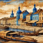 The painting depicts a vibrant coastal scene with colorful buildings and a sandy beach. Four women in retro outfits lounge on boats, evoking a playful, nostalgic vibe against a picturesque backdrop.