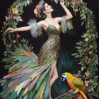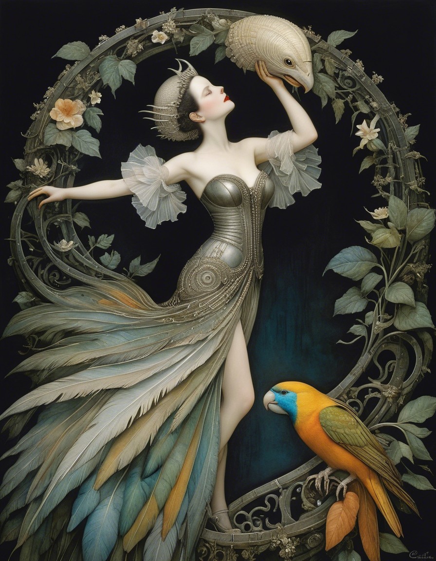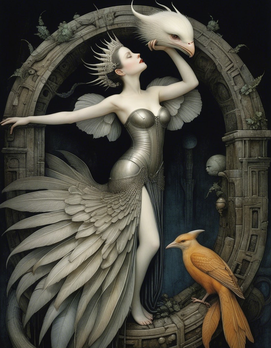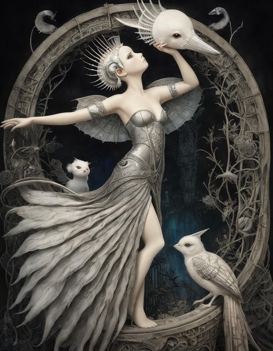 The image features a surreal figure with elegant features, wearing ornate headgear resembling wings and a creature. She holds a small white cat, set against a dark, mysterious backdrop.