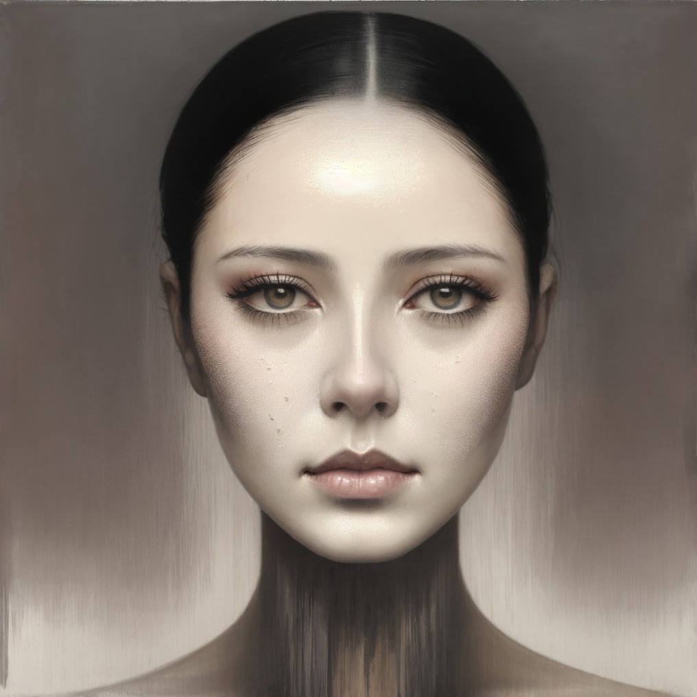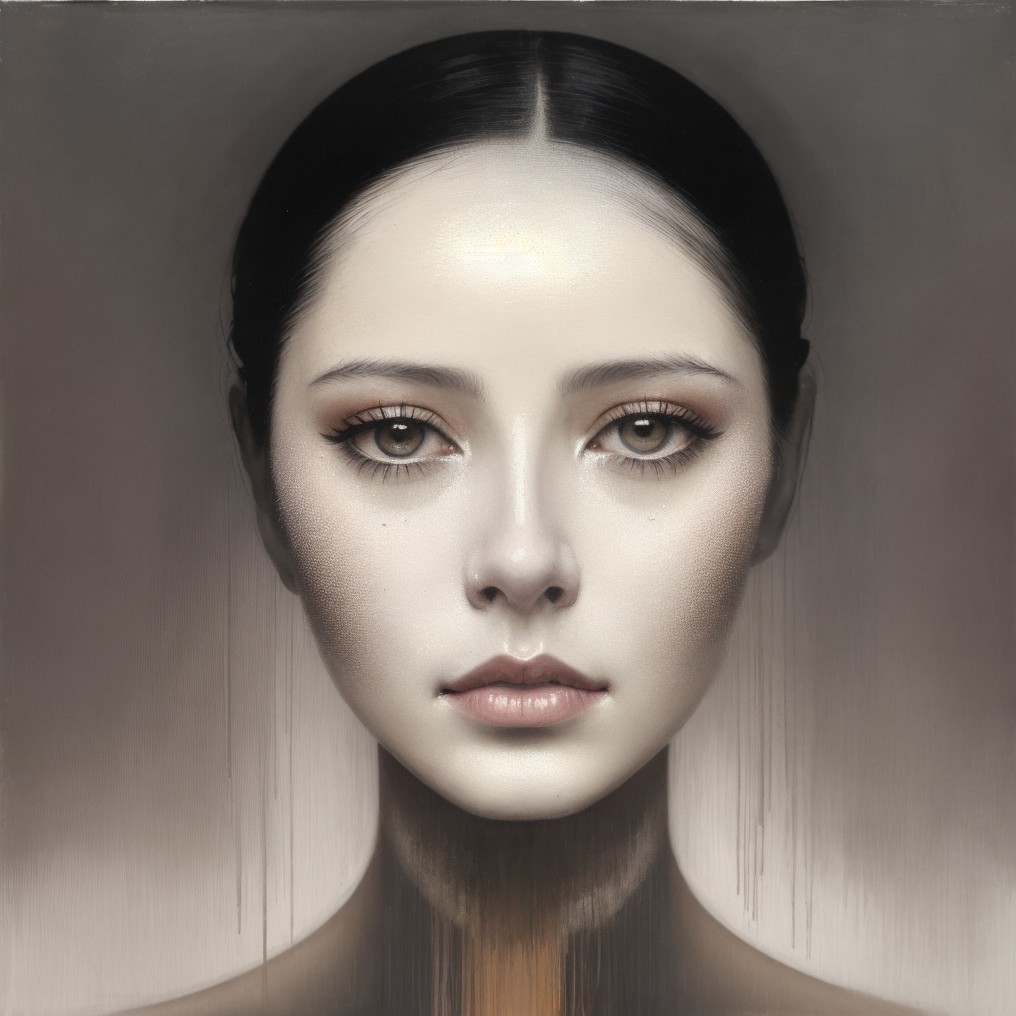 A striking, ethereal portrait of a woman with long, dark hair and expressive eyes, featuring streams of liquid cascading down her face, evoking a sense of emotion and introspection.