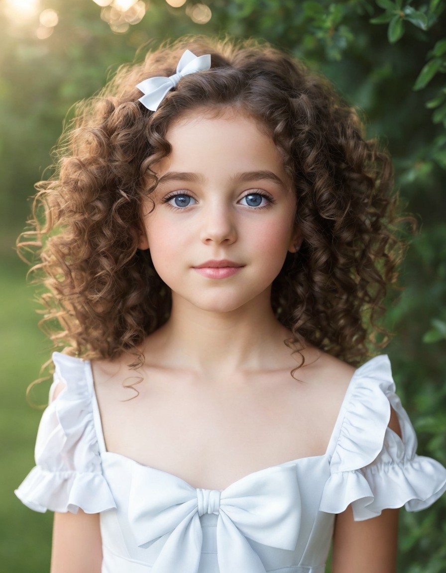 A young girl with curly hair and a white bow in her hair smiles softly. She's wearing a light-colored dress with ruffled sleeves, set against a green, natural background.