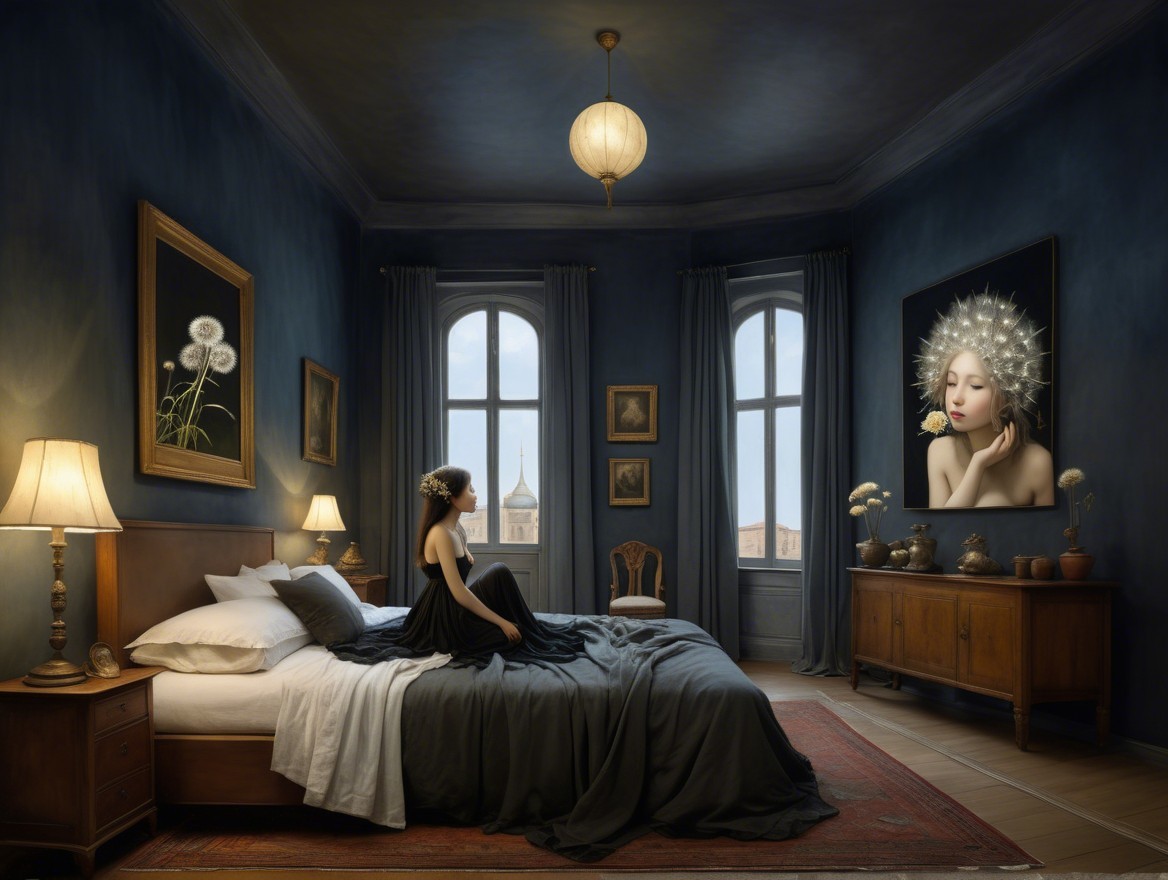 A serene fairy sits by a tranquil lake, holding a dandelion. Surrounded by vibrant flowers and soft moonlight, she embodies enchantment and whimsy in a dreamlike landscape.