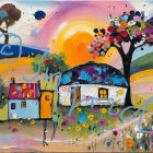 A vibrant landscape features a charming white cottage with a red roof, surrounded by colorful trees in autumn hues, a winding path, and blooming flowers under a sunny sky with fluffy clouds.