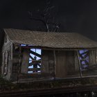 A dilapidated wooden house stands surrounded by barren trees at night, with a glowing light emanating from a window, hinting at life amidst the decay and neglect of its surroundings.