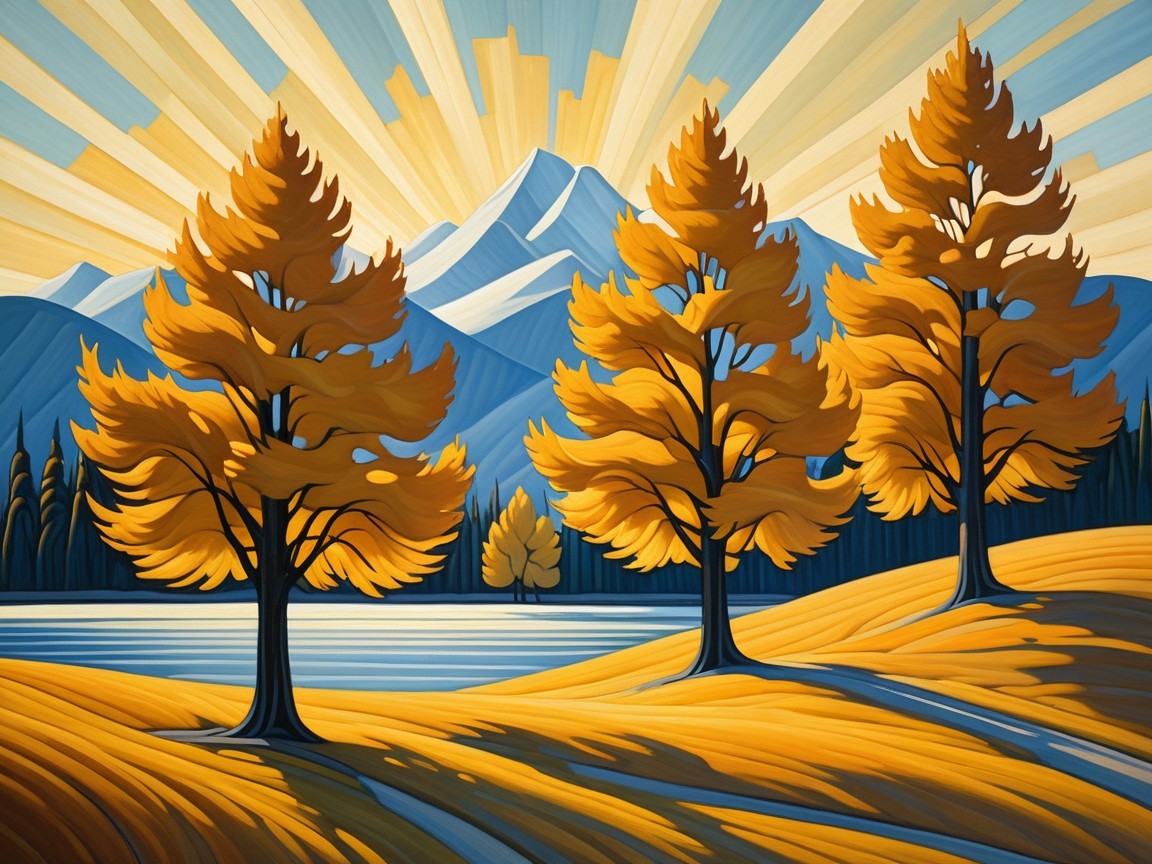 A vibrant landscape painting in a stylized art nouveau fashion, showcasing a golden field with blue striped patterns on a sunny day. In the middleground stands an abstract tree with lush yellow and orange foliage, its branches painted black. Another smaller yellow tree is to the left, and a third is to the right