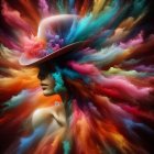 A striking portrait of a woman with vibrant, colorful splashes of paint swirling around her, wearing a pink hat. Her serene expression complements the dynamic, artistic background.