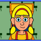 A whimsical character with bright yellow braids and striking big eyes smiles at the viewer. She's wearing a vibrant orange dress and a red headband, with colorful earrings. Floral-patterned background.