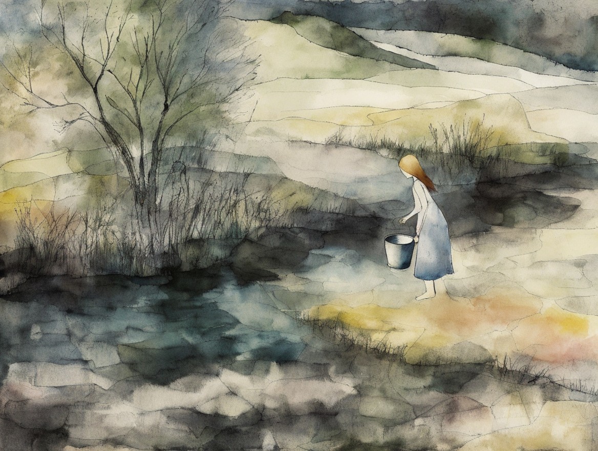 A girl with a bucket stands by a calm river amidst a tranquil, dreamy landscape with soft, watercolor hues. From my own image.