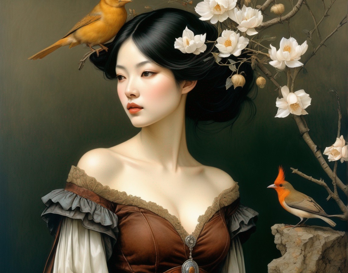 An ethereal woman with flowing hair, a butterfly in her hair, and a bird on her hand, set against a muted backdrop.