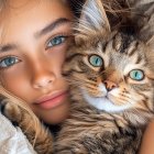 A young girl with long, flowing hair smiles softly as she cuddles a small, striped kitten. They are wrapped in a cozy, fluffy blanket, radiating warmth and affection.