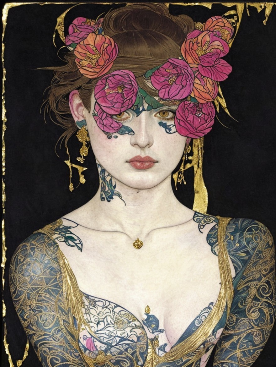 Artistic illustration of a woman adorned with floral and golden patterns on her head, face, and body against a black background.