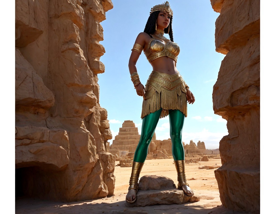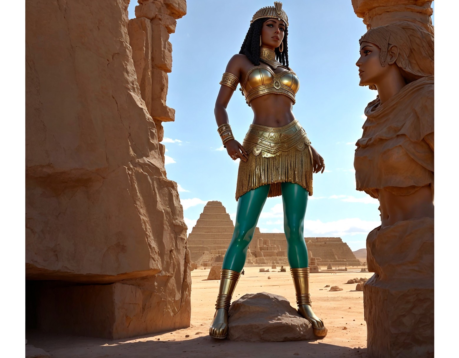 Two women in ancient Egyptian-style costumes are posing among sandstone ruins under a clear blue sky.