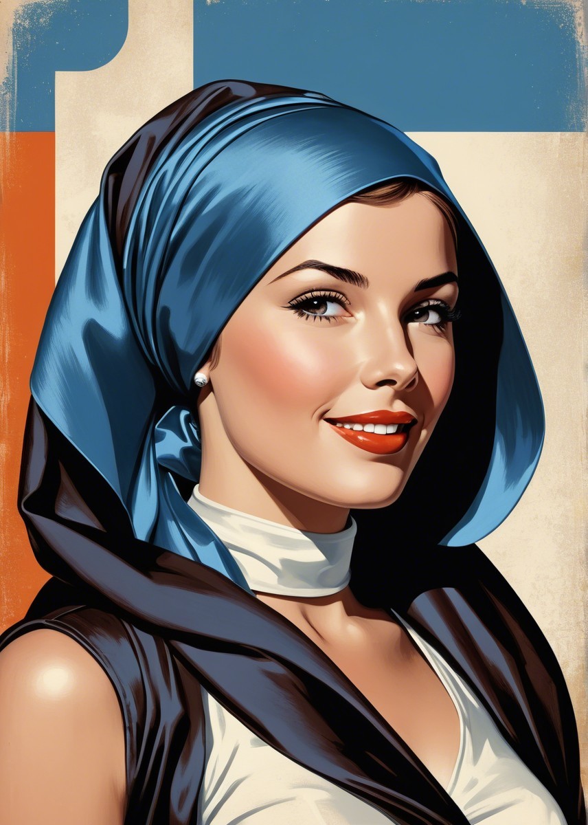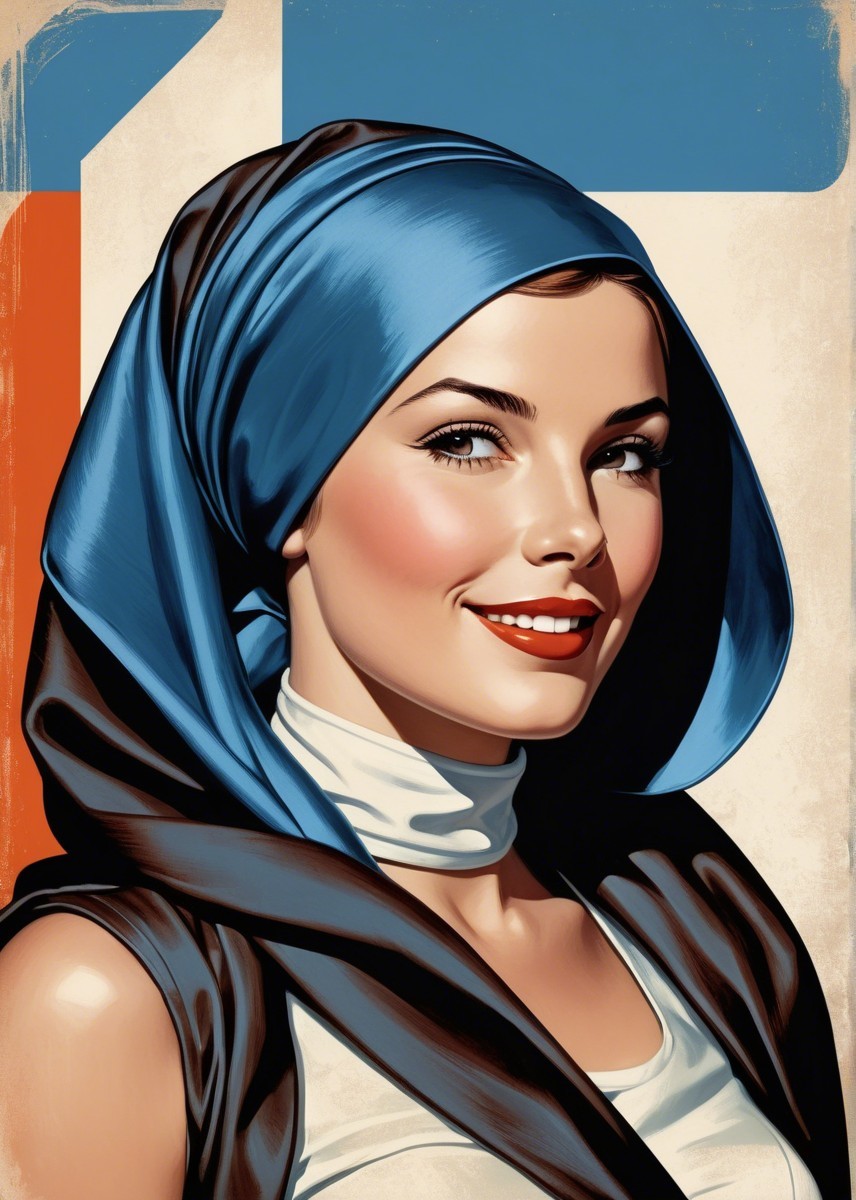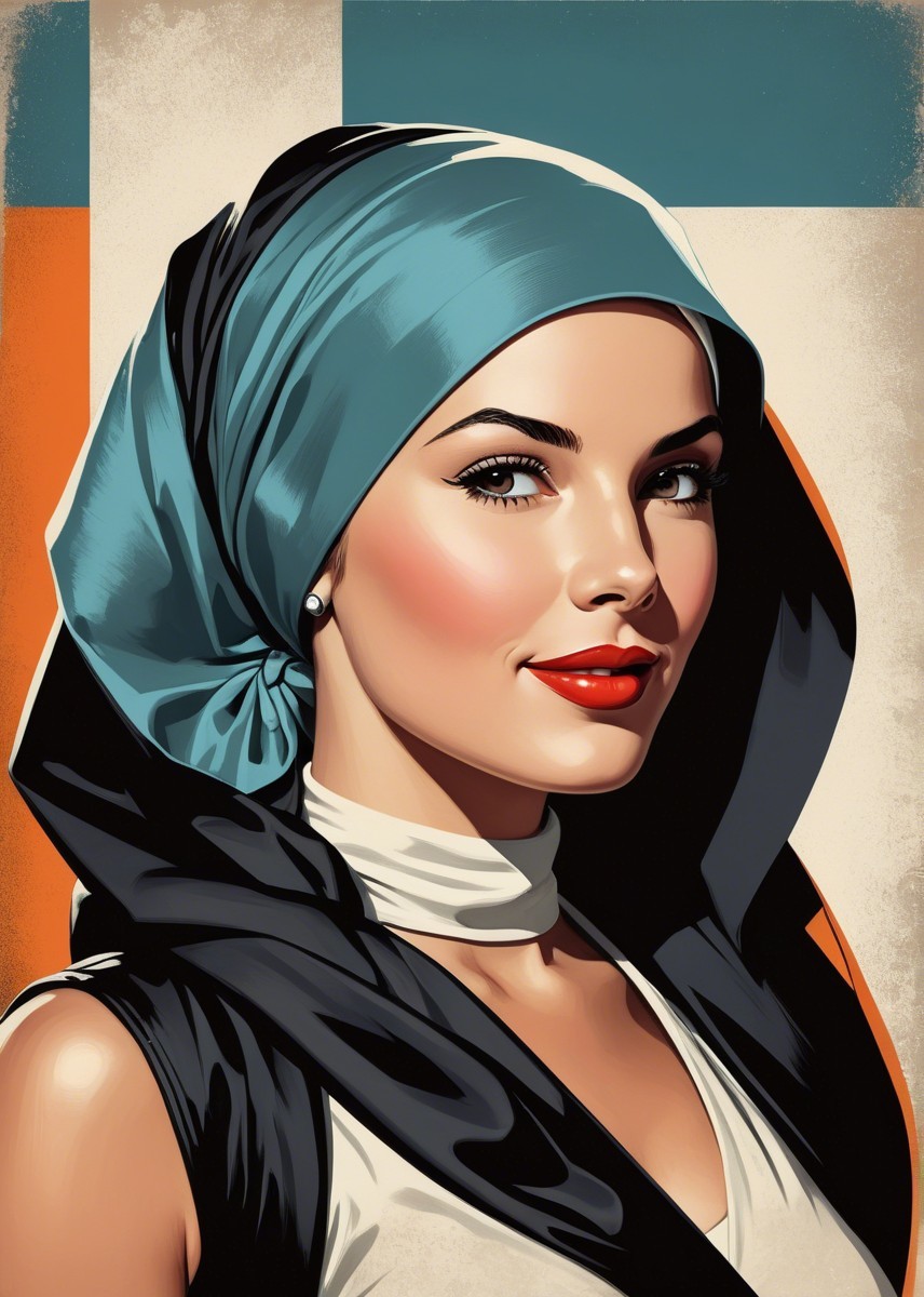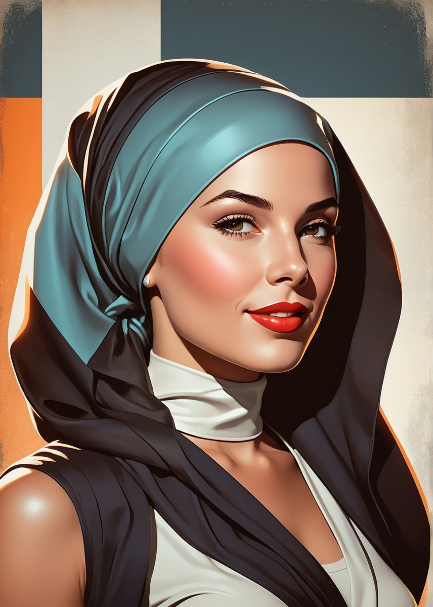 Prompt: Portrait, stylized female headshot by Rik Oostenbroek, 1950s heroine with headscarf, joyful and minimalistic appearance, comic book cover art, stylized, retro-futuristic headscarf, tesselated, angled, upper body portrait, collagraphy by Albert Pinkham Ryder and Ho Baron and Gerald Brom, blue satin headsscarf, brown hairstreaks, stylized collagraphy by Ed Binkley, stippled elements, cel-shaded, sculpted, angled, side view, great depth and scale, dreamlike color palette with HDR and UHD, visible textures, --ar 1:1 --q 2 --s 750, brightened color palette, pointilism, mokuhanga art, multi-layered eyes, gradient inking colors of maya-blue, bold outlines, stylized hairdo, post-avantgarde style, fine-line illustration, merged styles of Devin Allen & Jacques de Loustal, hues by Overton Loyd, portrait with inking outlines, intricate light and dark shapes, color shapes, novelty architecture, dyed, dof, bokeh, debeh, subsurface scattering 1.2, contoured, warm orange, light-blue, warm yellow tones, cubistic-inspired background, swirling patterns, dynamic lighting 1.5, geometrical line-art, warm bluish gradients & hues, catenaries, lineage, abstract organic shapes, intricate geometric designs, funky atmosphere, luminous glow, geometrical composition, celebratory vibes, brightened tones, complex interplay of light and shadow, diffused light, raytraced shadows 1.6, color shapes in background, natural, delicate tones for indiecore style, stylized hues by Ed Binkley, rough paint accentuating her features, color palette of light-yellow light-green light-blue, hues by Overton Loyd, intricate details, pastel tones in simplified color scheme, dyed art with parallax occlusion and subsurface scattering, bright watercolors, intricate alcohol ink effects, oversprays of color. overall composition by Nino Eliashvili, André Hambourg, and Ignasi Mundo, warm tones, complex interplay of light and shadow, diffused light, raytraced shadows 1.6, brightness 1.3,
