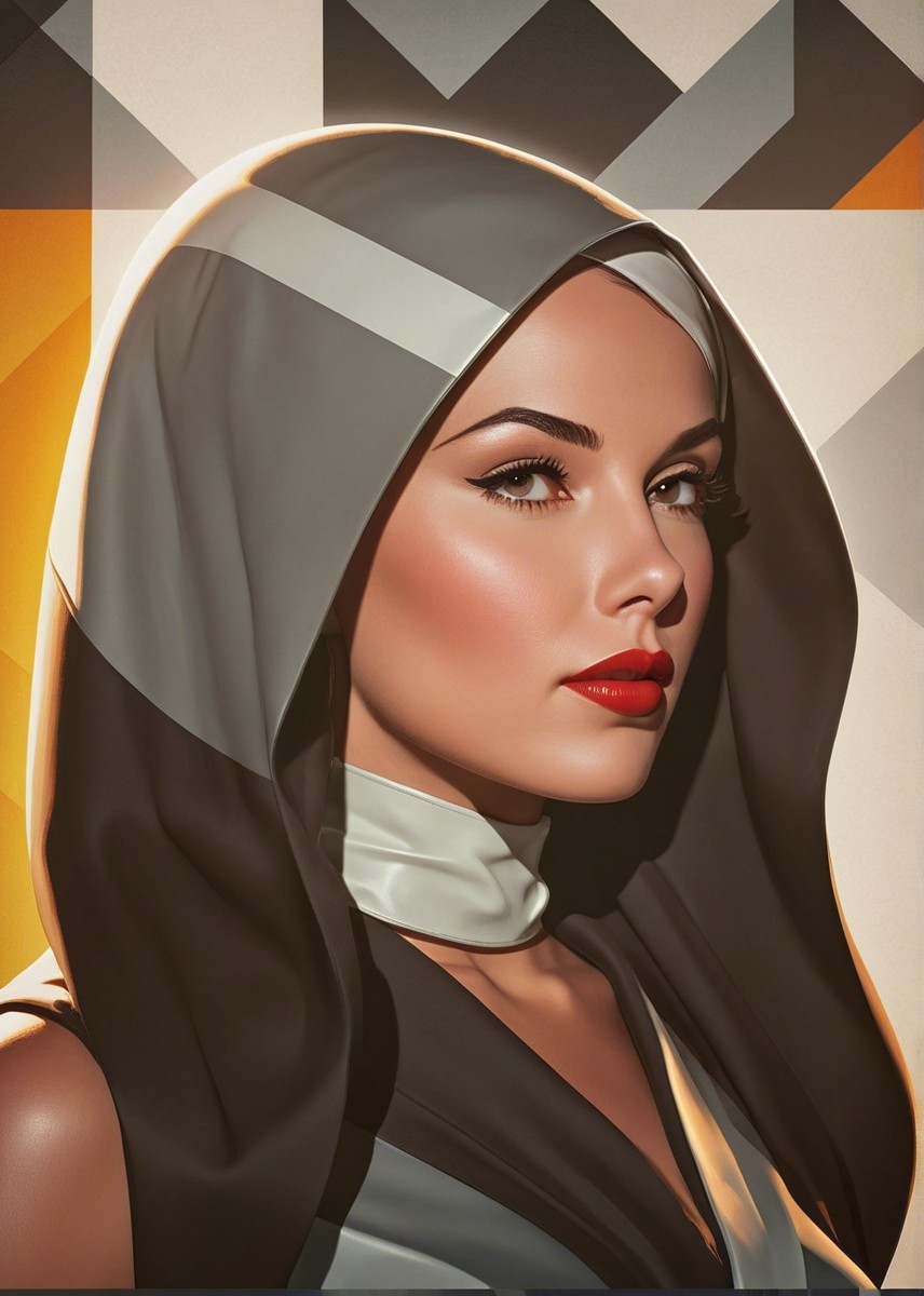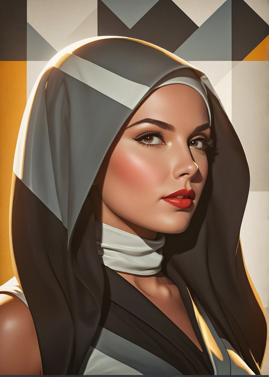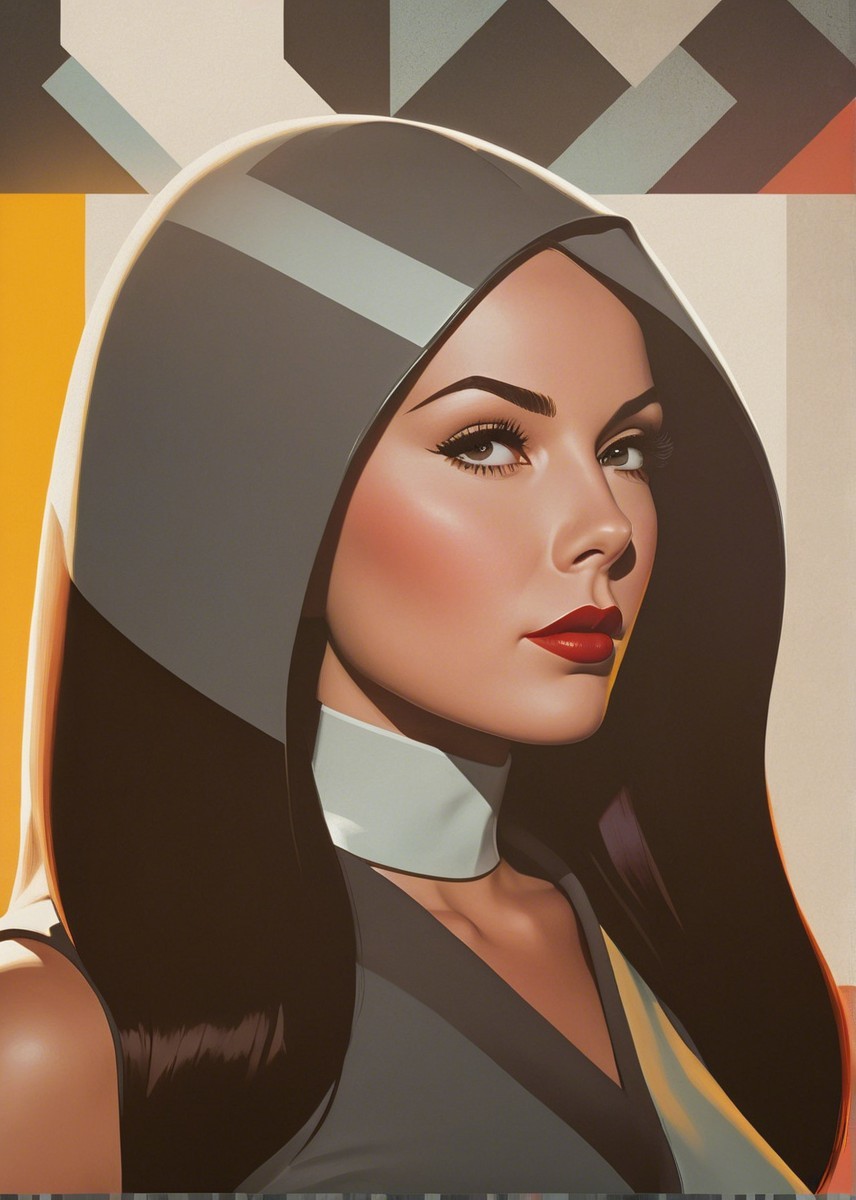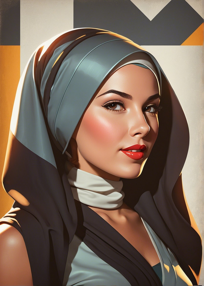 Prompt: Portrait, stylized female headshot by Rik Oostenbroek, 1950s heroine with headscarf, joyful and minimalistic appearance, comic book cover art, stylized, retro-futuristic headscarf, tesselated, angled, upper body portrait, collagraphy by Albert Pinkham Ryder and Ho Baron and Gerald Brom, blue satin headsscarf, brown hairstreaks, stylized collagraphy by Ed Binkley, stippled elements, cel-shaded, sculpted, angled, side view, great depth and scale, dreamlike color palette with HDR and UHD, visible textures, --ar 1:1 --q 2 --s 750, brightened color palette, pointilism, mokuhanga art, multi-layered eyes, gradient inking colors of maya-blue, bold outlines, stylized hairdo, post-avantgarde style, fine-line illustration, merged styles of Devin Allen & Jacques de Loustal, hues by Overton Loyd, portrait with inking outlines, intricate light and dark shapes, color shapes, novelty architecture, dyed, dof, bokeh, debeh, subsurface scattering 1.2, contoured, warm orange, light-blue, warm yellow tones, cubistic-inspired background, swirling patterns, dynamic lighting 1.5, geometrical line-art, warm bluish gradients & hues, catenaries, lineage, abstract organic shapes, intricate geometric designs, funky atmosphere, luminous glow, geometrical composition, celebratory vibes, brightened tones, complex interplay of light and shadow, diffused light, raytraced shadows 1.6, color shapes in background, natural, delicate tones for indiecore style, stylized hues by Ed Binkley, rough paint accentuating her features, color palette of light-yellow light-green light-blue, hues by Overton Loyd, intricate details, pastel tones in simplified color scheme, dyed art with parallax occlusion and subsurface scattering, bright watercolors, intricate alcohol ink effects, oversprays of color. overall composition by Nino Eliashvili, André Hambourg, and Ignasi Mundo, warm tones, complex interplay of light and shadow, diffused light, raytraced shadows 1.6, brightness 1.3,