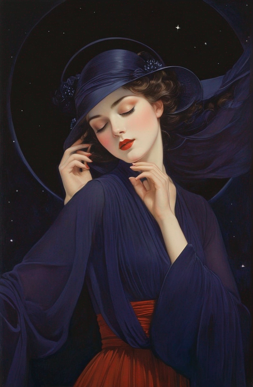 by Leonetto Cappiello, In the silent corners of the night, You dance like a flame, soft and bright, A moonbeam trapped in a human form, Grace in every gesture, every norm