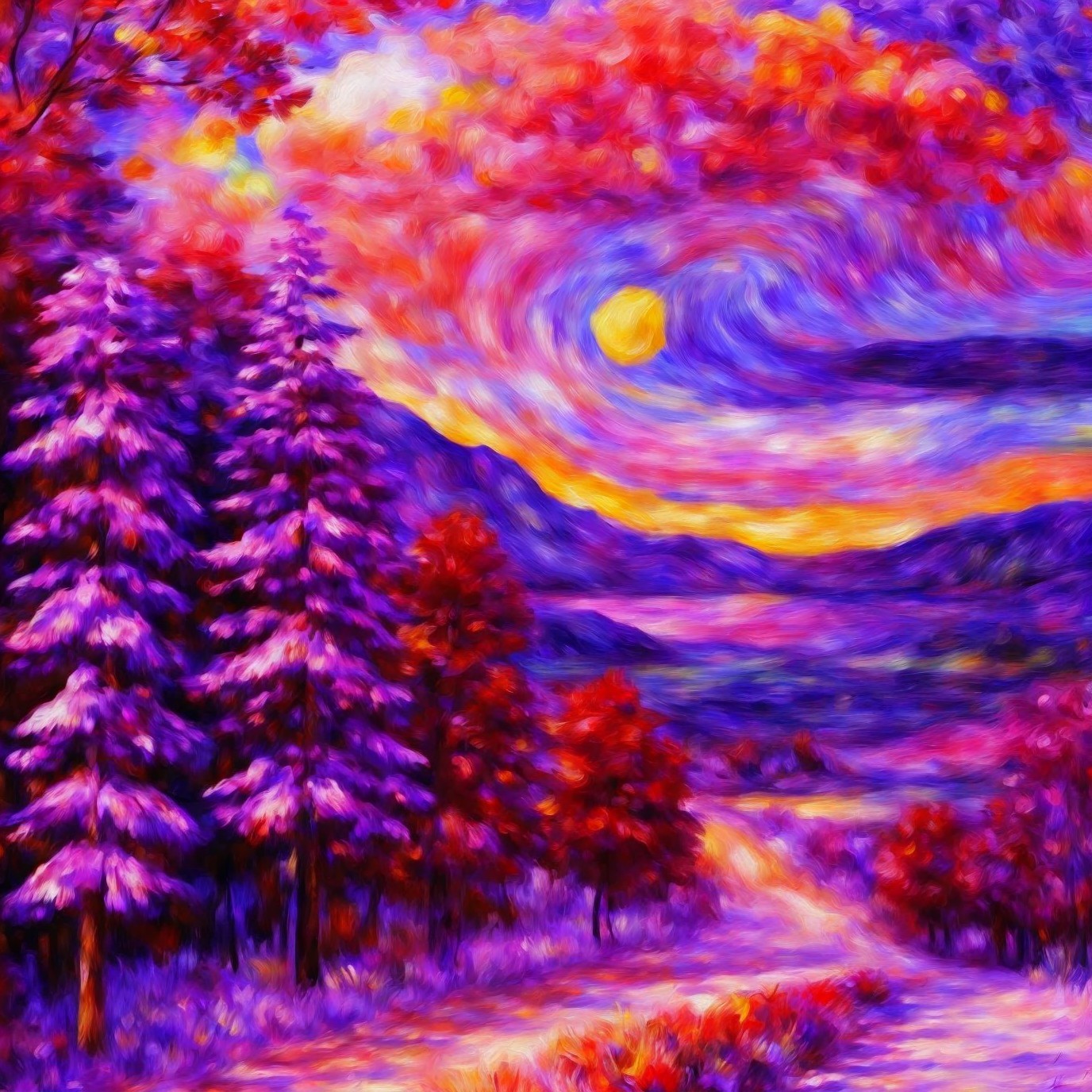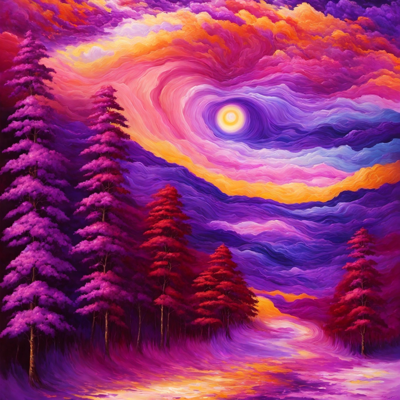 A vibrant, stylized landscape with swirling purple and orange skies, a path leading through red pine trees under a cosmic eye-like formation.