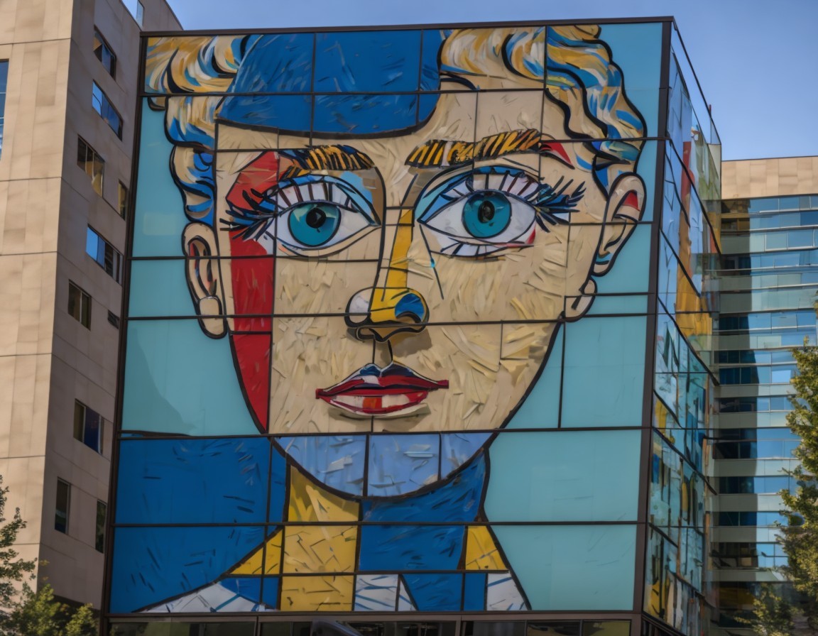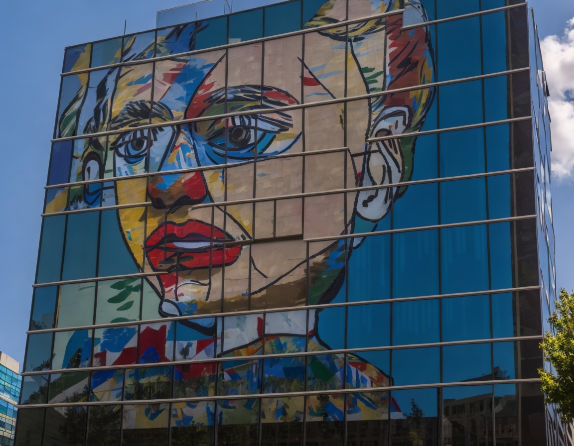 Large Mural with Geometric Face on Building Facade