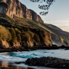 A stunning coastal scene features rugged cliffs adorned with greenery, crashing waves against dark rocks, and a warm glow of sunset illuminating the tranquil ocean beneath a partly cloudy sky.