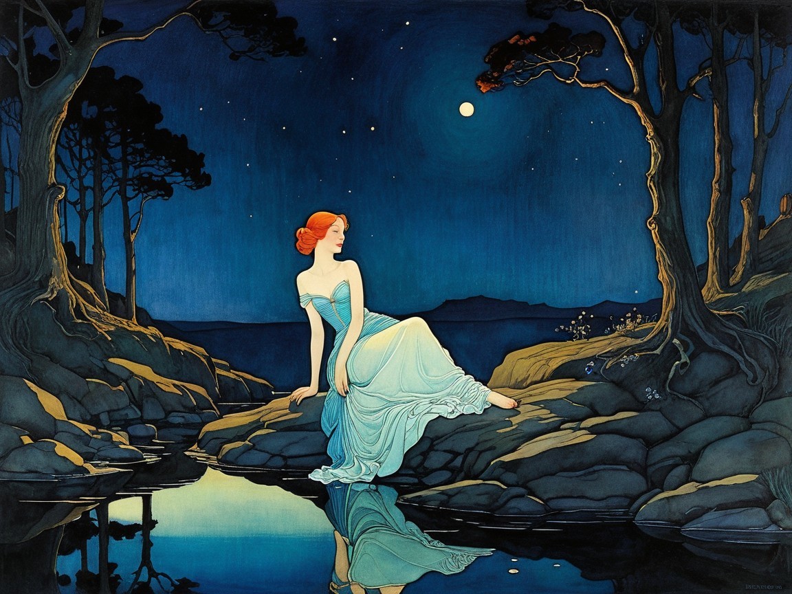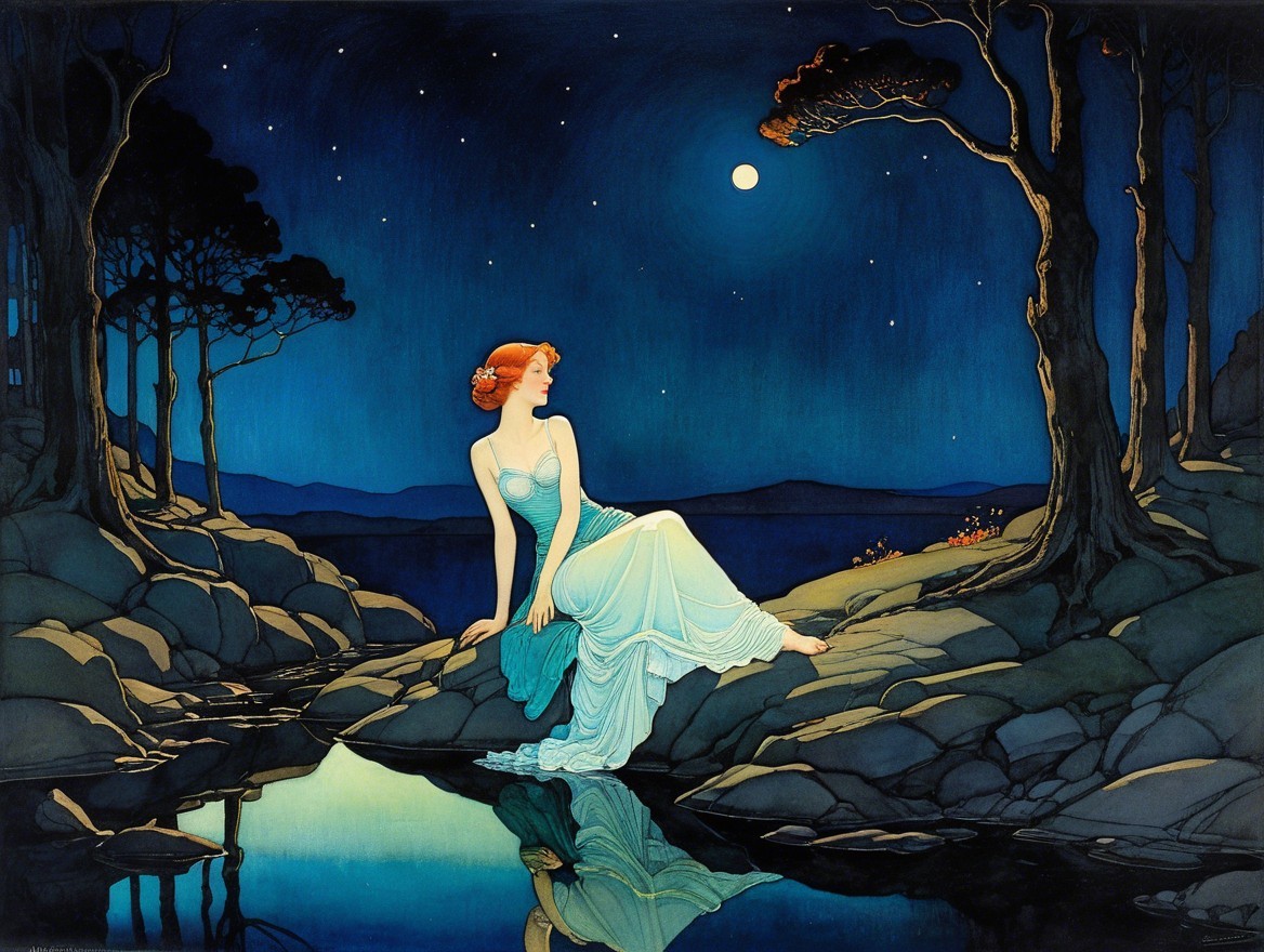 A serene woman with flowing red hair sits by a tranquil pond, surrounded by lily pads and white flowers. She wears a flowing green dress, exuding a calm, mystical presence in a dreamlike setting.