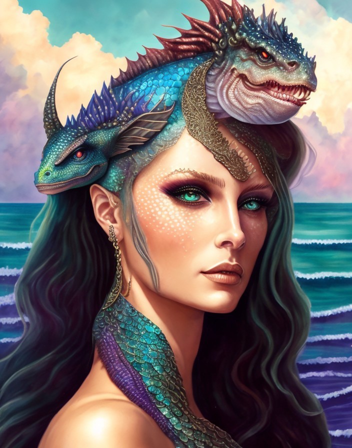 Illustration of a woman with sea-inspired makeup and two dragons intertwined in her hair, against an ocean backdrop.