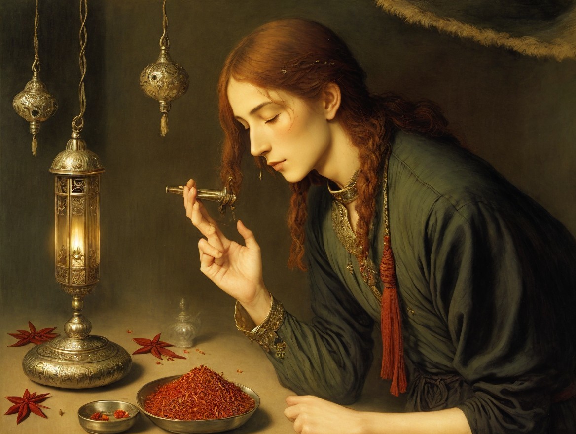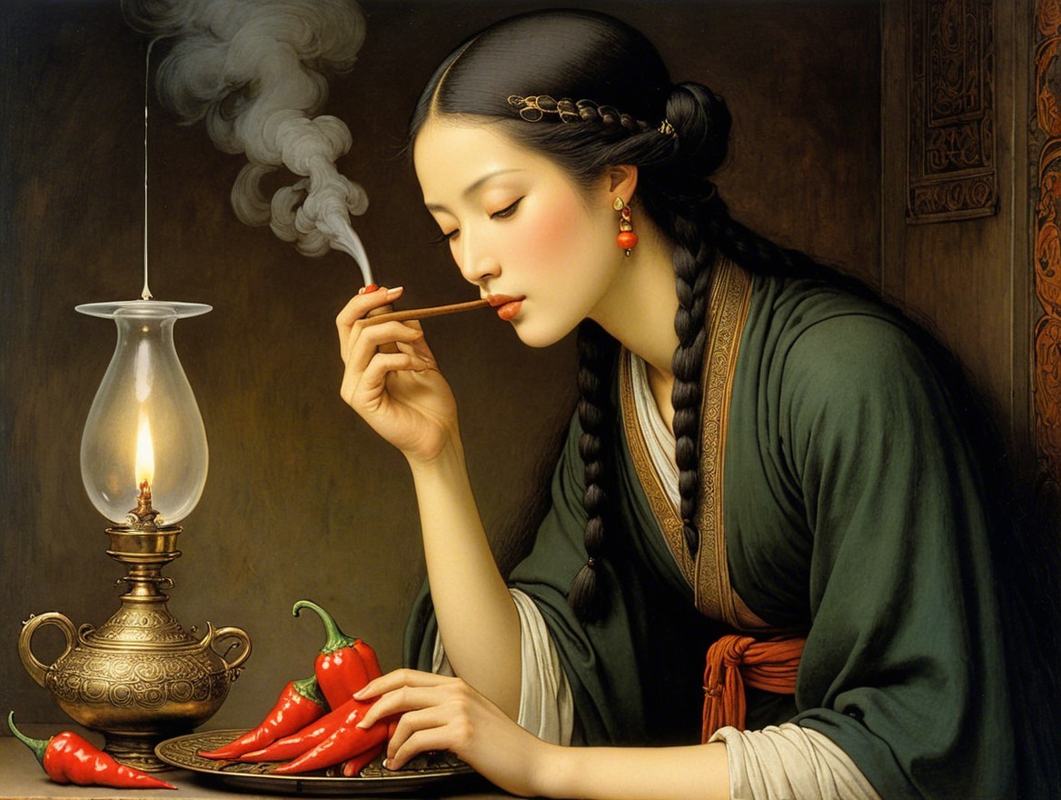 A serene woman in traditional attire delicately holds a stick over a glowing lantern, with smoke swirling around her. Rich textures and warm colors create a captivating ambiance.