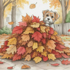 Prompt: With playful lines and vibrant autumn color, a huge raked pile of autumn leaves; an adorable scruffy dog looks out of the center with bright eyes; fresh leaves are falling everywhere, an abstracted background is a cozy yard with trees and a wooden fence. A pencil and crayon sketch by Quentin Blake, Ralph Steadman, adorable dog by Cecil Aldin