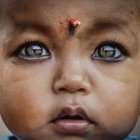A close-up of a young child with striking blue eyes and soft features. She has a gentle expression, wearing a light blue sweater, and her brown hair is styled with delicate strands framing her face.