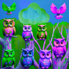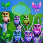 A vibrant, colorful illustration features six stylized owls perched on branches. Each owl showcases unique patterns and hues, set against a bright, cheerful background of trees and clouds.