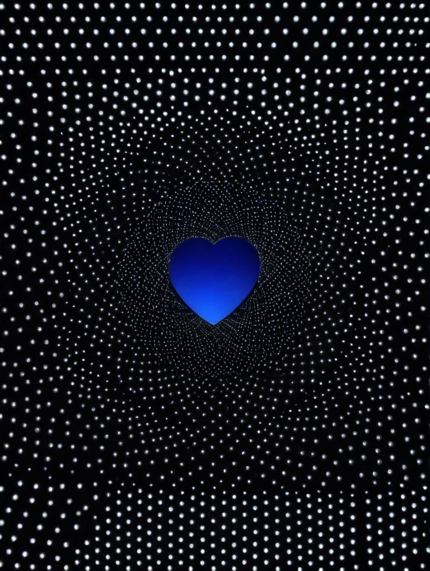 The image features a mesmerizing vortex of blue dots, culminating in a glowing blue heart at the center, creating a captivating and dynamic visual effect against a dark background.