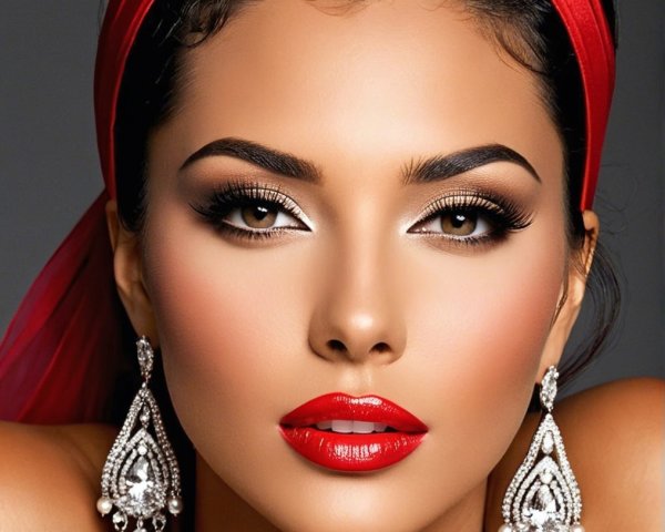 A woman with long, flowing orange hair poses confidently in a stylish setting. She wears a fitted white tank top and light pink pants, with a background featuring floral decor and soft lighting.