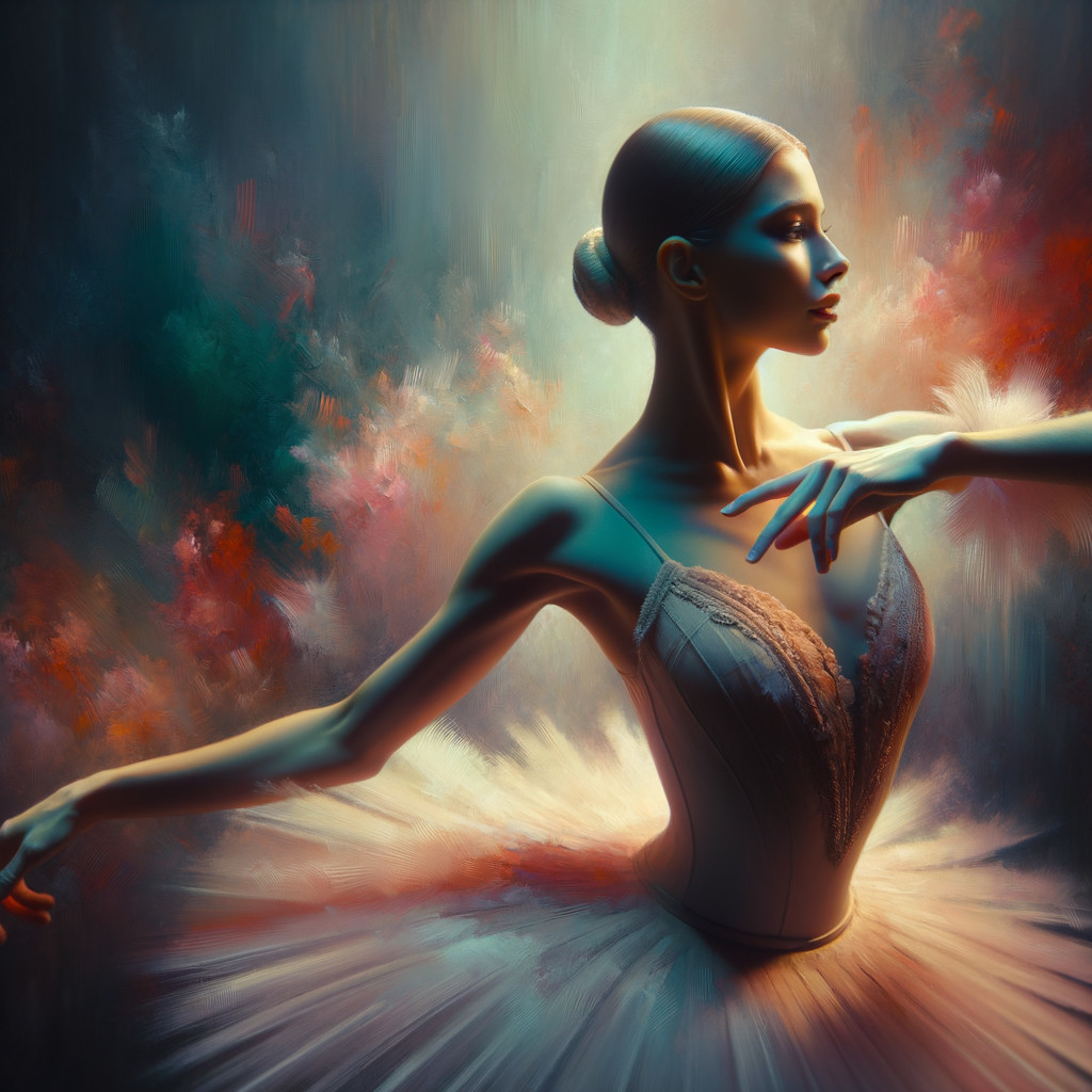 Prompt: Zoom out. A graceful ballerina, elegant hand gesture. The background consists of soft-focus abstract floral patterns in shades of pink, blue, orange, and cream, with a dreamlike array of bokeh specks dotted around, adding a magical atmosphere. The image has an overall ethereal and surreal quality, with a harmonious pastel color palette that combines the dancer with her fantastical surroundings.What could she possibly be self-conscious about? She is a ballerina, a perfect work of art!