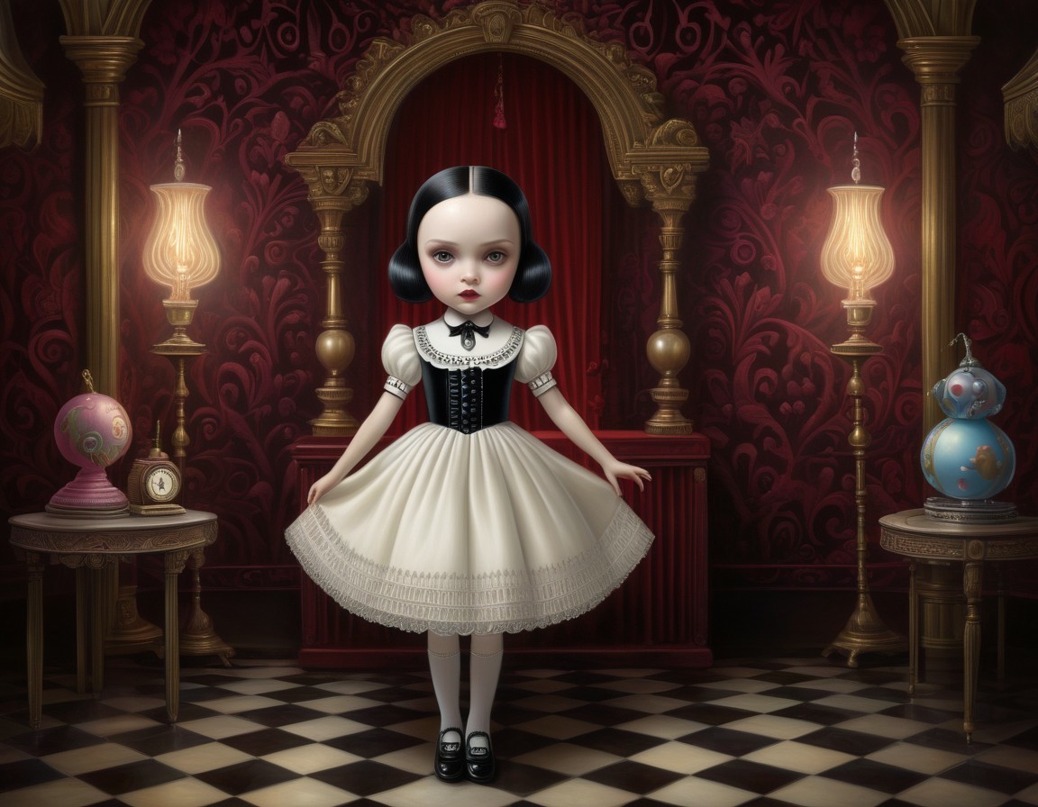 beautiful Wednesday Addams teen, dancing by mark ryden, nicoletta ceccoli, naoto hattori, fractal psychedelic, lsd, electricity
