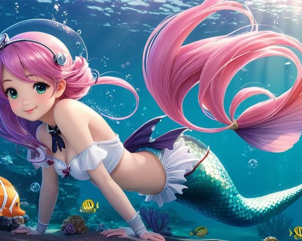 A charming anime girl gracefully floats underwater, her dazzling nightgown shimmering with vibrant colors. The serene surroundings create a magical ambiance, highlighting her enchanting presence.
