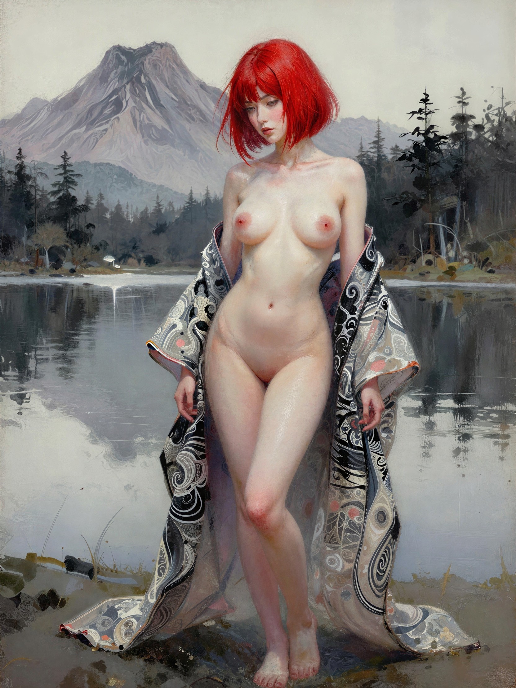 stunning female portrait, vibrant short red hair, traditional Japanese features, revealing sheer kimono attire, serene lake backdrop, majestic mountain vista, peaceful ambiance, detailed ink strokes, intricate patterns, dynamic composition, Japanese art influence, realistic with a touch of fantasy, soft natural lighting."