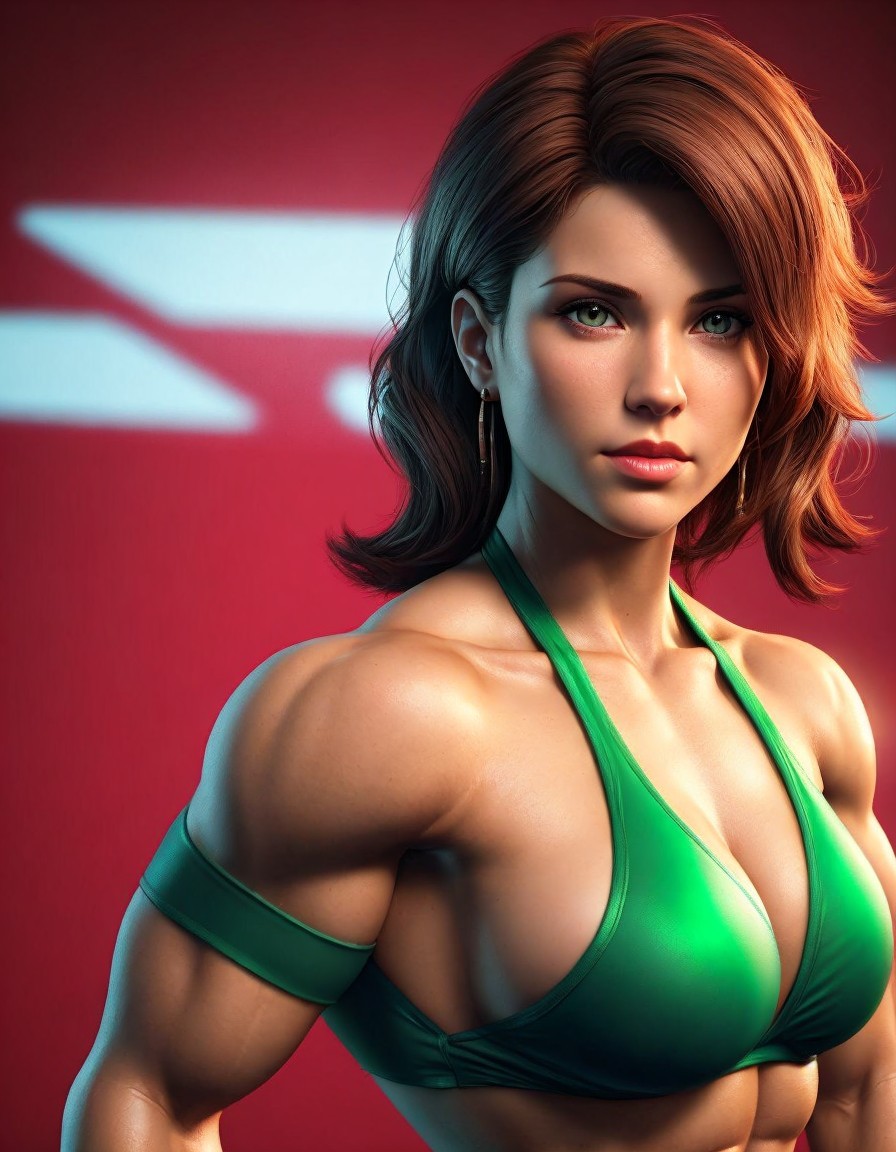 Prompt: Ultra Detailed Depth Map effect portrait of Jennifer barconi, Female Bodybuilder,Short Brown hair and Green eyes,Age 29 years old, Wearing Red Velvet Bikini top and Mini Skit as a KOF style character, Character Design and Illustration by Shinkiro