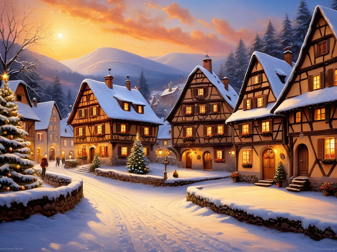 A picturesque winter village scene features charming, snow-covered cottages adorned with festive decorations. Snowflakes fall gently, and a Christmas tree stands proudly in the foreground.