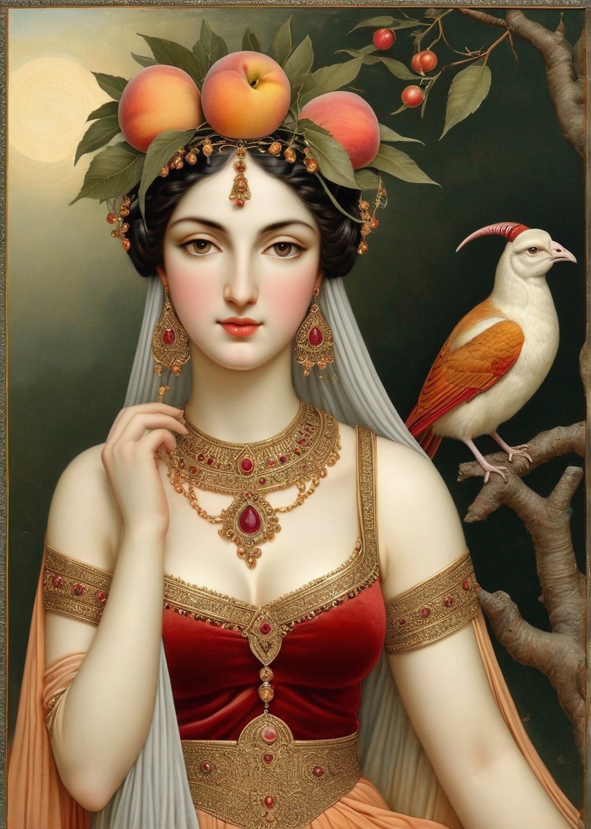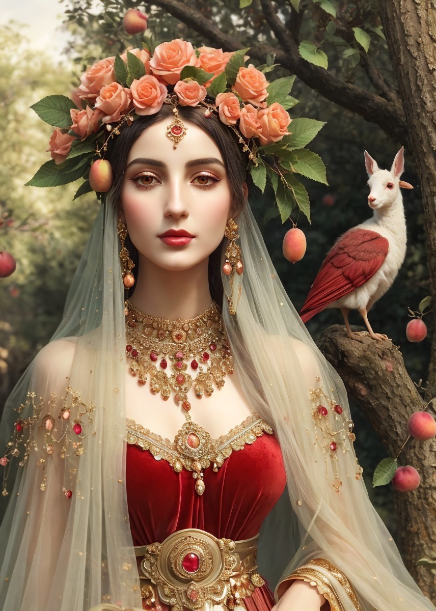 + Prompt:Epimelides are also called meliades. These nymphs reside on apple and other fruit trees and are also known as protectors of sheep. 3rd century Persian miniature art, warm peach, Ruby red, Velvet Black, Shabby, Dull Gold, Amber Gray, Golden Ratio, Surreal Fantasy, Elegant, High Definition Ultra Fine 3D Line, Zenangle Style, Watercolor Patchwork , Arthur Rackham Style, Paul Kidby, , Jacek yerka, Extremely Detailed, Intricate, Thoughtful, HDR, Fractal, Beautiful, Award Winning, Fantasy Look, Fantasy, Crisp Quality
