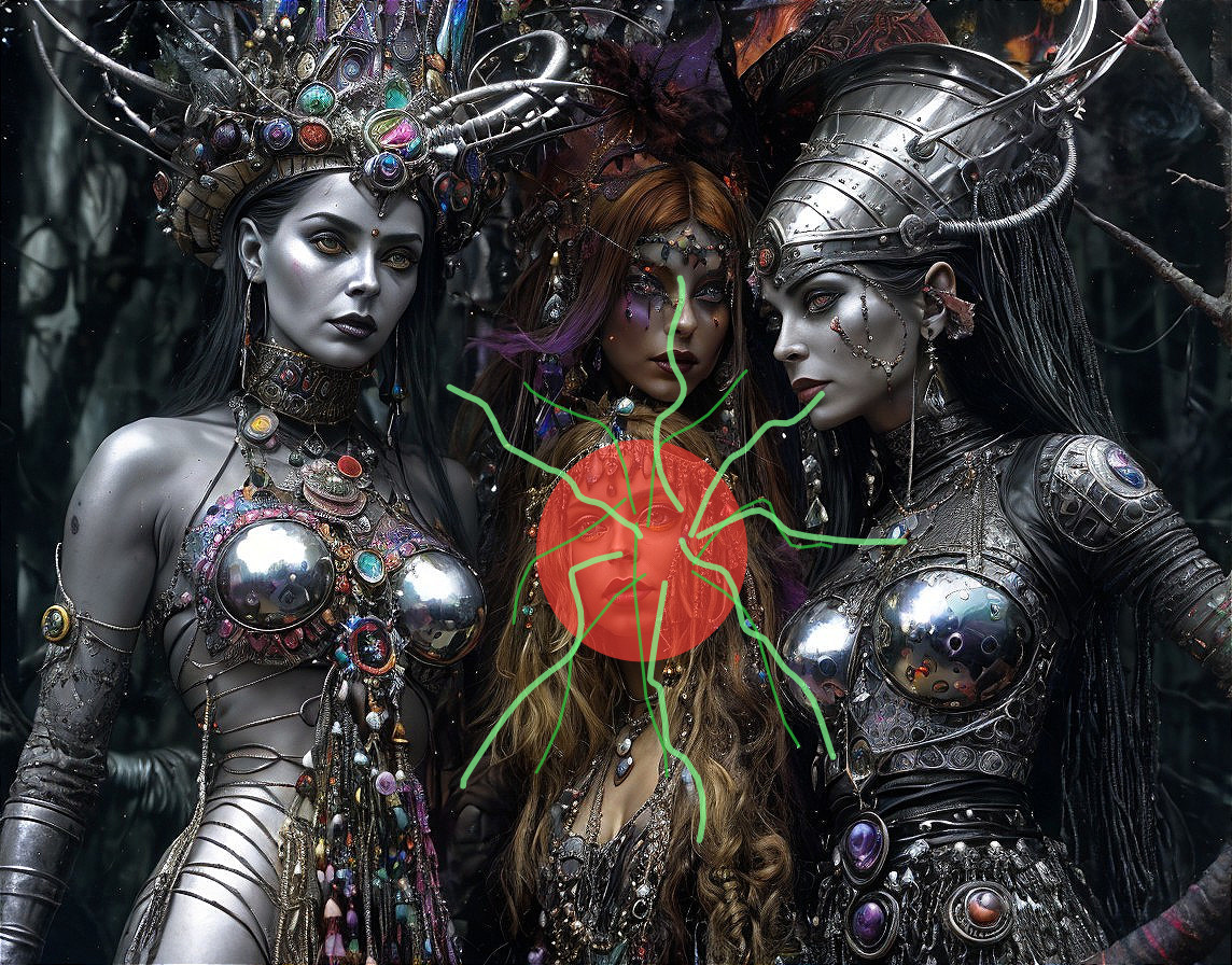 + Prompt:Three beautiful witches with cosmic metallic pyramid hats and wild giant eyes, hellish psychedelic colorful background, mixed media, by Frank Frazetta, Dave McKean and Tove Jansson, small metal paint details by Bill Sienkiewicz