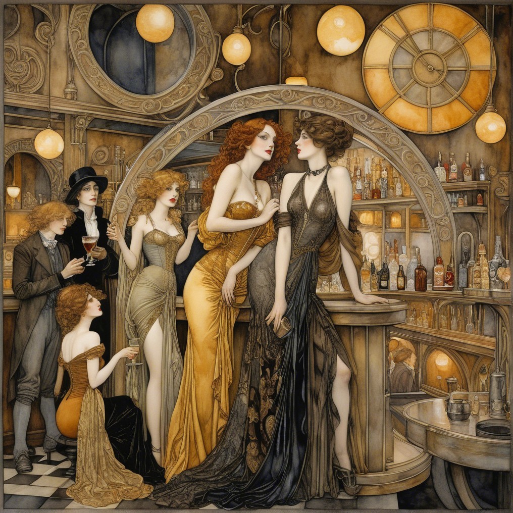 In a vintage bar setting, two glamorous women with striking features and voluminous curls pose elegantly. Bottles line the shelves behind them, illuminated by soft lighting, enhancing the sophisticated vibe.