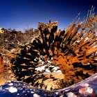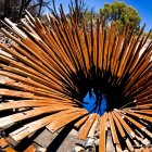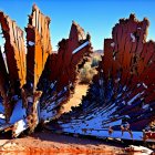 The image showcases two large, rusted metal structures resembling giant seashells or flowers, standing in a barren desert landscape under a clear blue sky. The ground is sandy, with sparse vegetation.