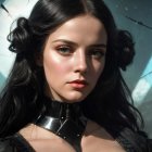 A young woman with long, dark hair styled in space buns gazes intently, wearing a metallic collar. Behind her, a cosmic backdrop features a large planet and distant celestial objects.