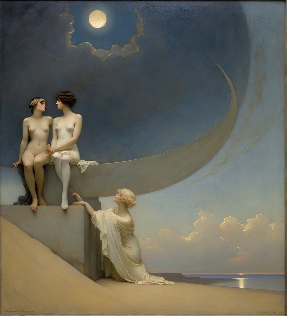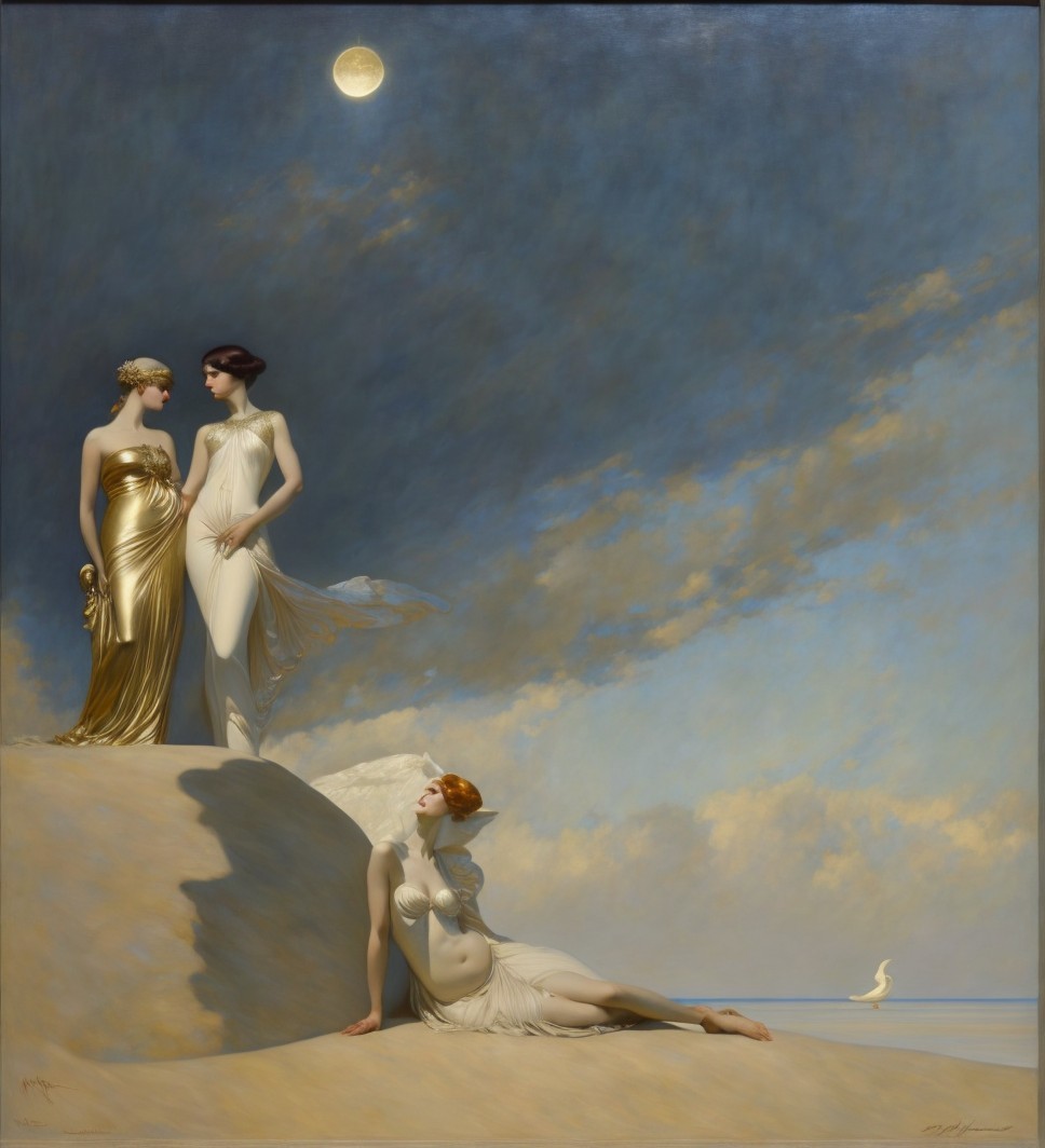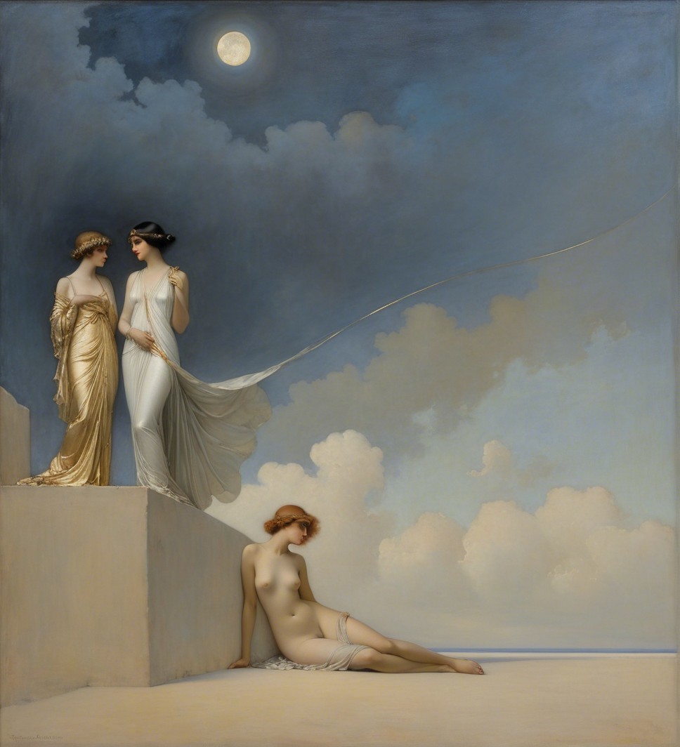 A elegant figure reclines in a flowing white gown, holding a pendulum beneath a crescent moon. Her serene expression and ornate jewelry evoke a sense of timeless beauty and mystique.