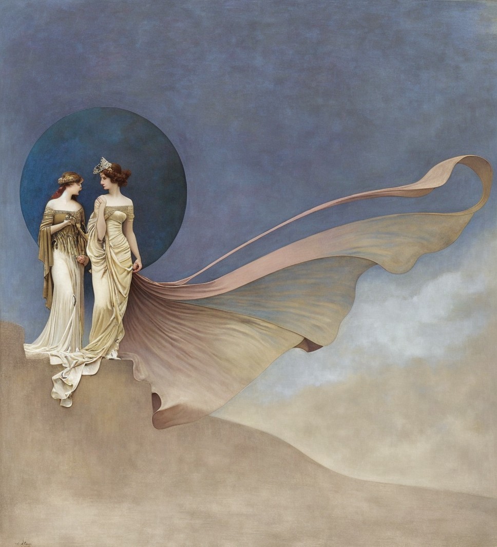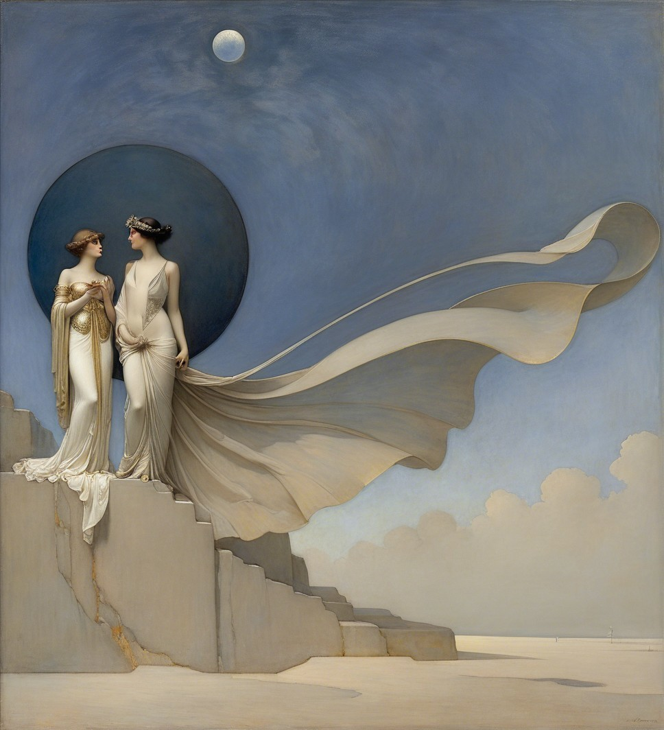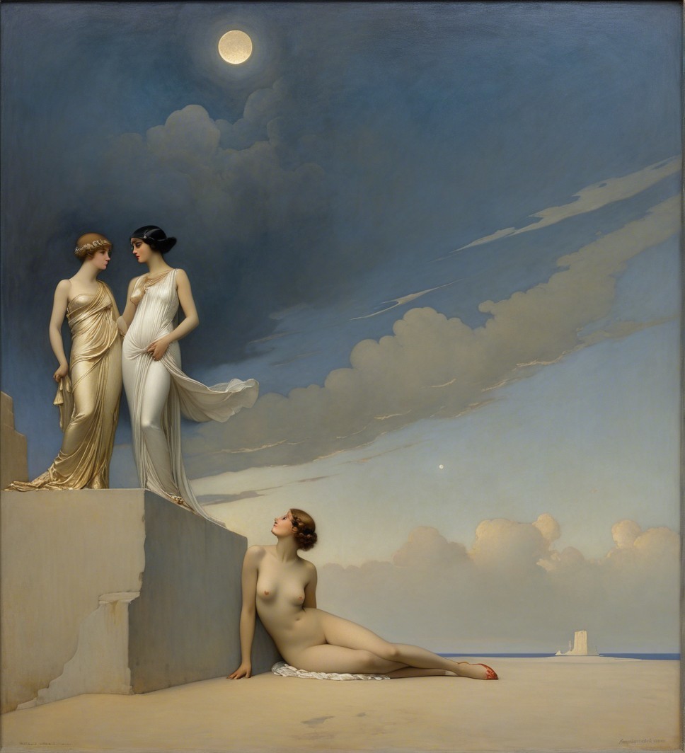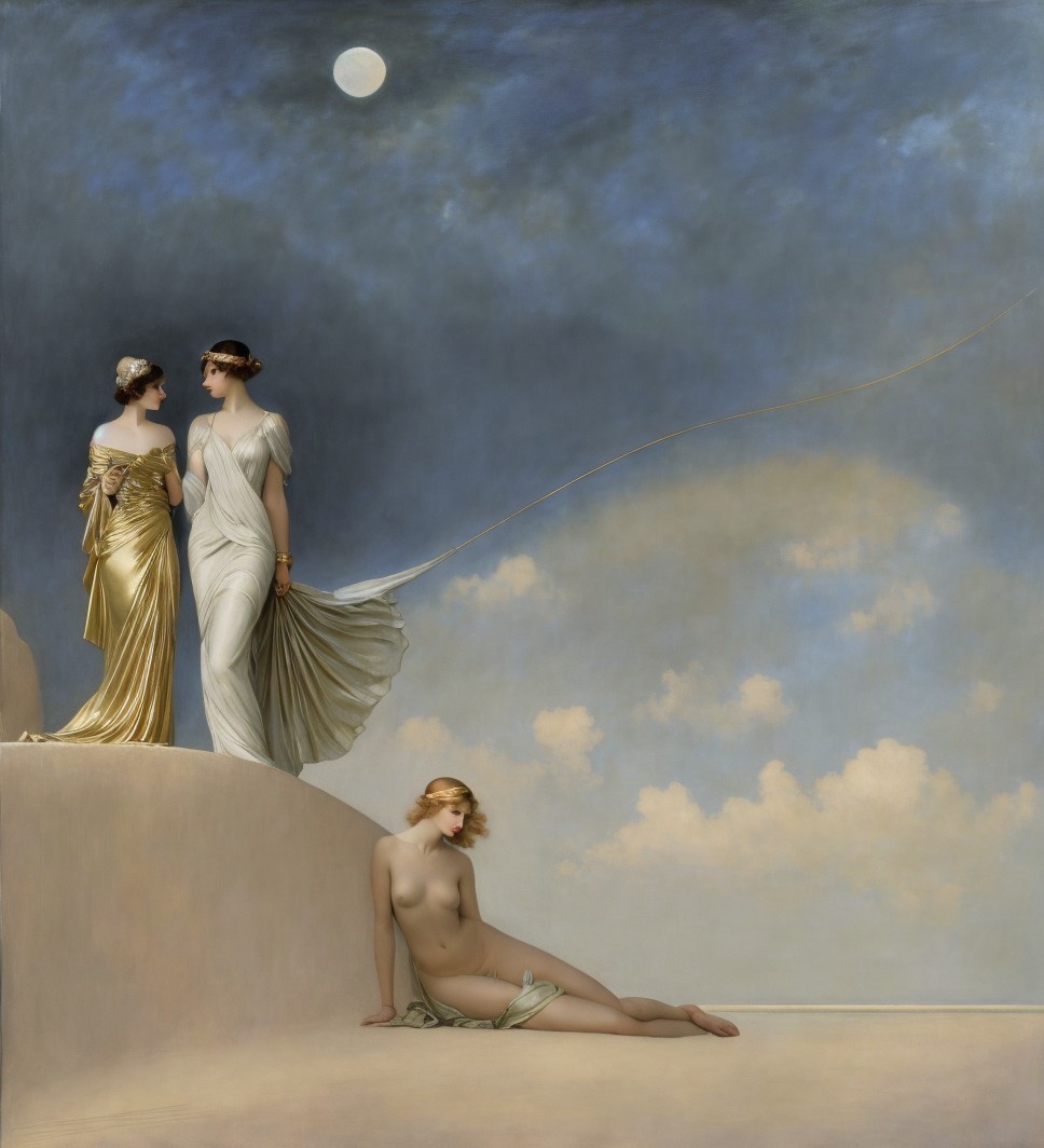 A elegant figure reclines in a flowing white gown, holding a pendulum beneath a crescent moon. Her serene expression and ornate jewelry evoke a sense of timeless beauty and mystique.